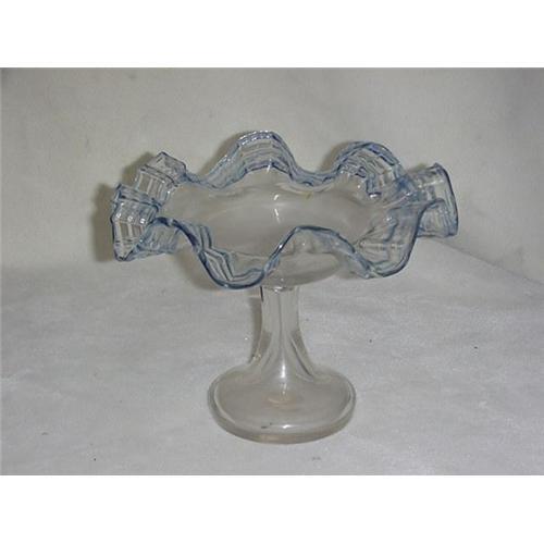 Glass Pedestal Bowl, blown glass with hollow base, ruffled bowl with applied blue glass trim. 7 3/4" tall x 10" in diameter. Small imperfections on base and rim.