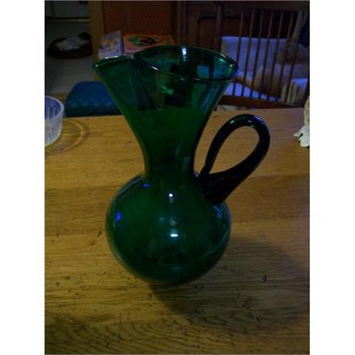 There are a few pieces of blown glass I am listing,all from the same house sale.The lady I purchased them from received them as wedding gifts when she was married in the 1960s.All very collectible and beautiful colors.Display beautifully.This pitcher is a turquoise green color and stands 11 1/2" tall.
