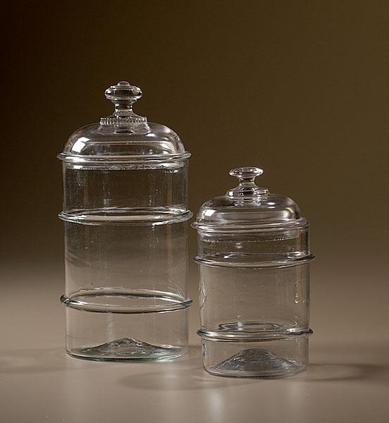 American, late 19th century, the pair of colorless glass jars with two applied rings, domed lids and applied finials; 7.75" and 11" high.