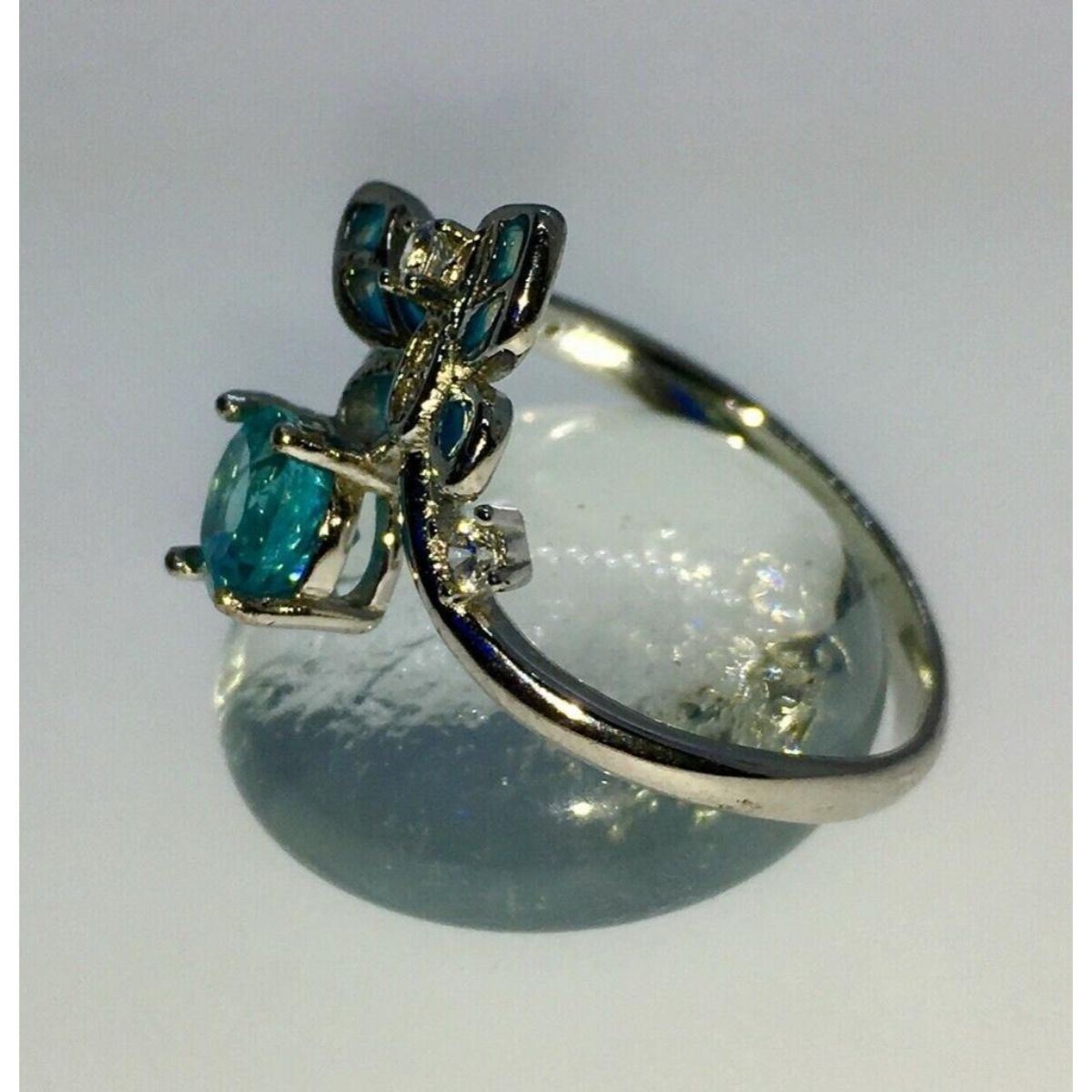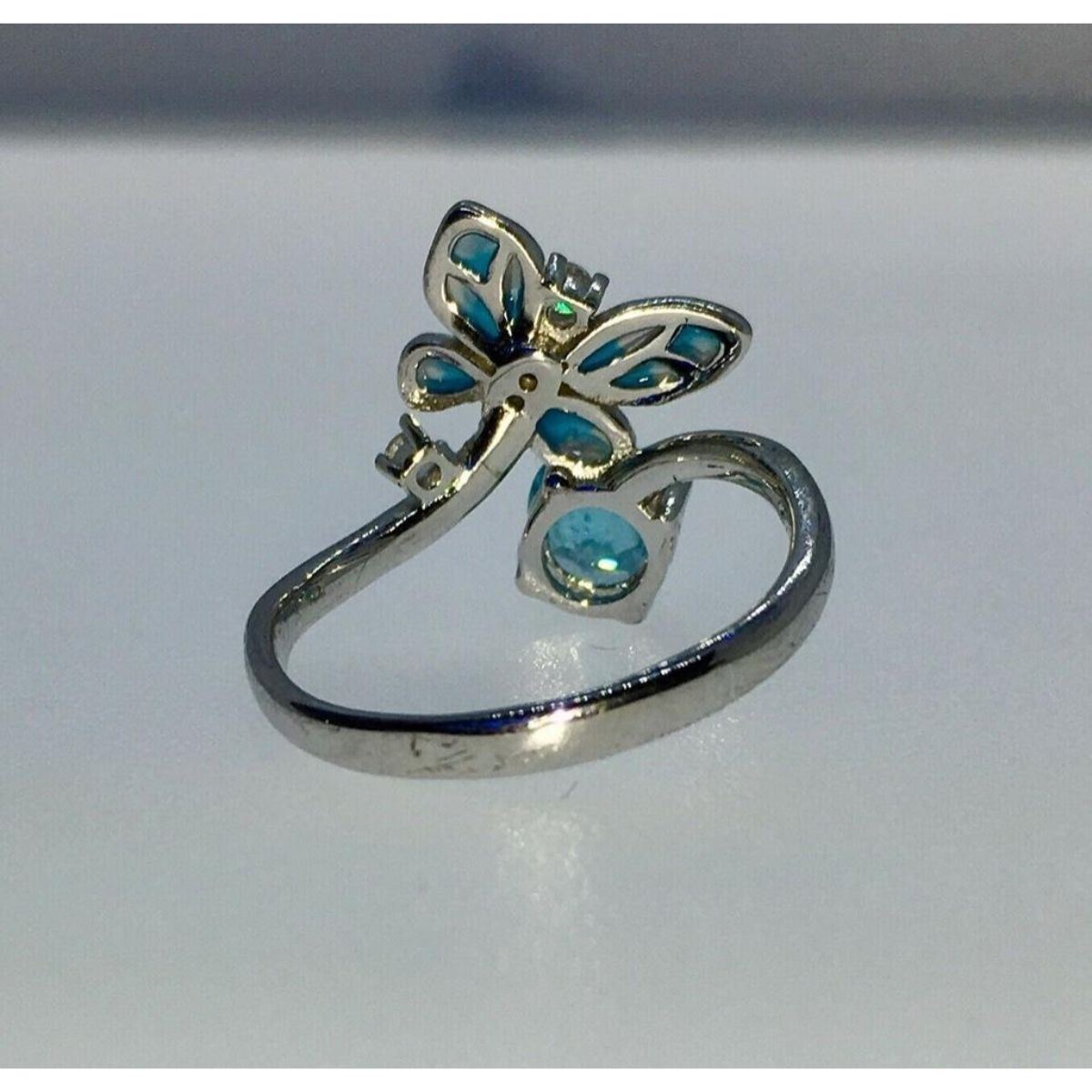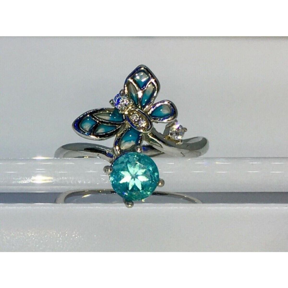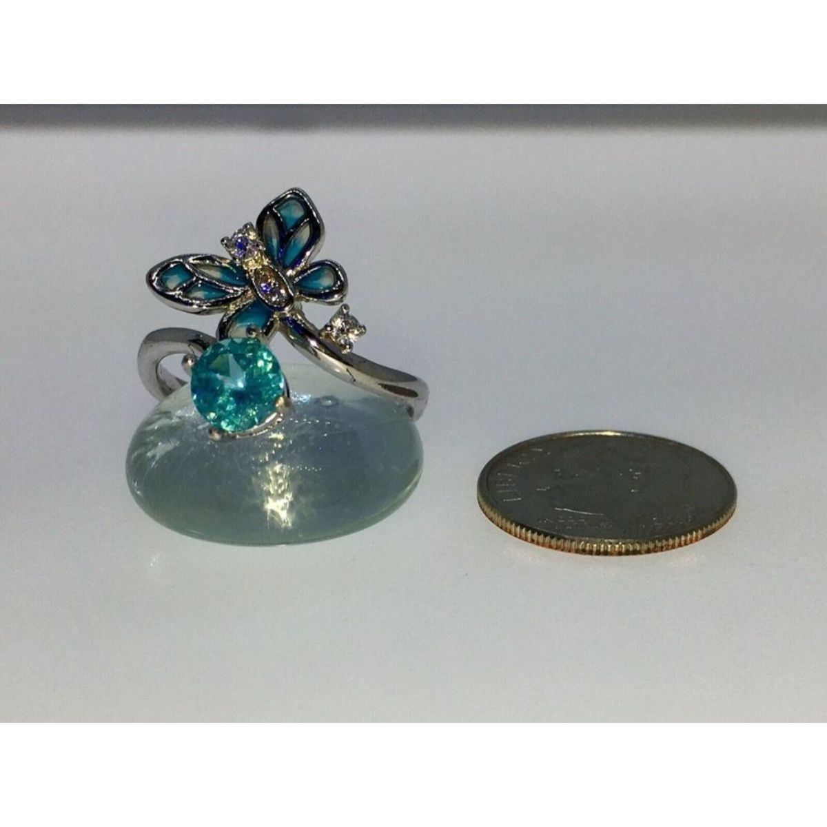 Blue Apatite faceted gemstone ( 6mm ) enamel & sterling silver ring in the form of a colorful butterfly. Size 7.5.