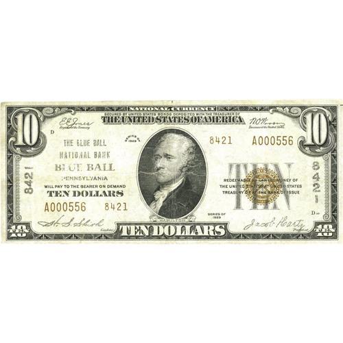 <B>Blue Ball, PA</B></I> - $10 1929 Ty. 2 <B>The Blue Ball NB</B></I> Ch. # 8421<BR>This otherwise <B>Very Fine</B></I> note comes from a bank with one of the most sought after bank titles available. Whenever notes from here are offered, they find an audience of multiple bidders and there are never enough available to satisfy the demands of the collecting fraternity. We take note of the fact that there is some fading to the black print of the charter number, bank and community name, but still expect this sought after item to sell in the range of...