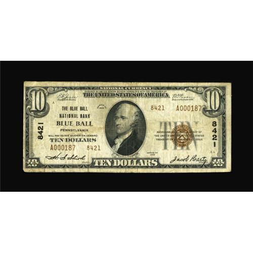 <B>Blue Ball, PA</B></I> - $10 1929 Ty. 2 <B>The Blue Ball NB</B></I> Ch. # 8421<BR> A nice Type 2 example from this much sought after location, possessor of one of the great names in Nationals. Nice <B>Fine+.</B></I><BR><BR><b>Shipping:</b> Coins & Currency (<a target="_blank" href="http://www.heritageauctions.com/common/shipping.php">view shipping information</a>)