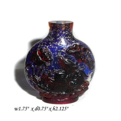 This is a hand-made high quality Peking glass snuff bottle. Inside the blue base is golden flake mixed in. The red color motif of birds has precise detail. The decent and delicate make this snuff bottle a great collection item as well as a treasure gift. </p>