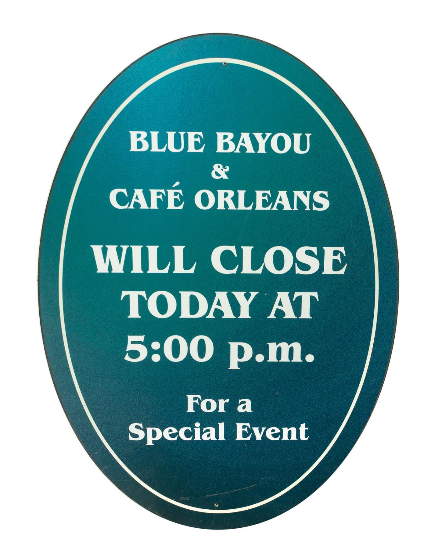 (Disneyland, 2010s) A rare sign used to announce a temporary closure of both the Blue Bayou and Cafe Orleans restaurants for a special event. The sign is printed on PVC board and has a screw hole at the top and bottom from its original installation. Measuring 25"x18", the sign is in good condition with some surface scratches from use.