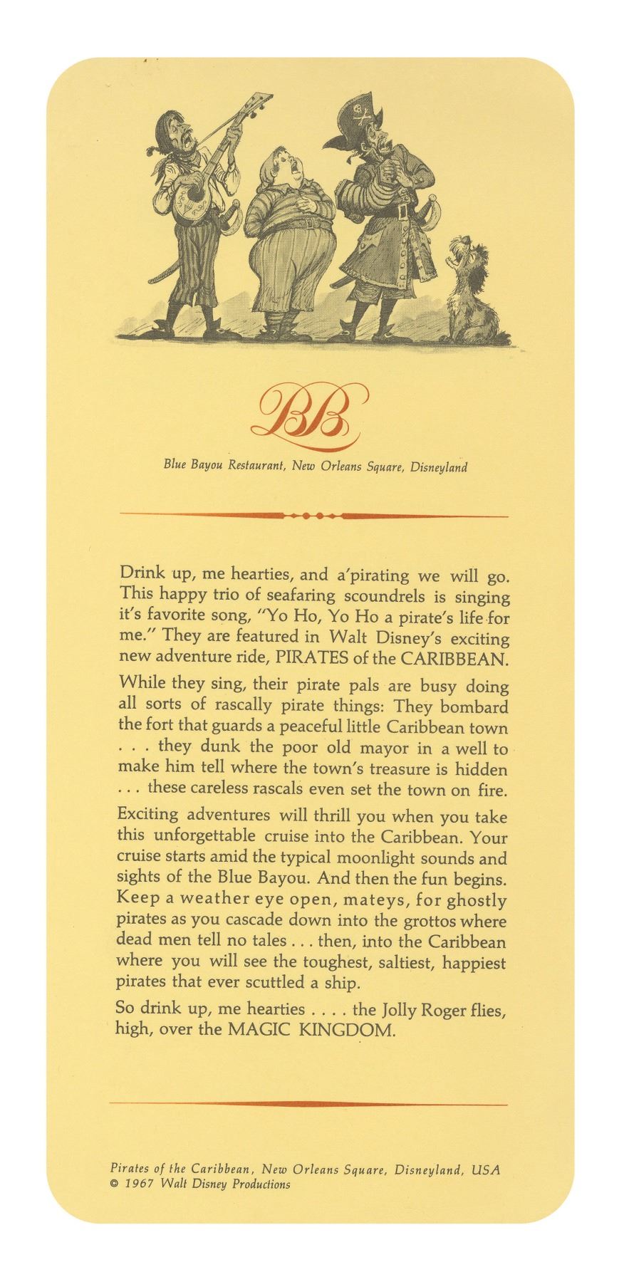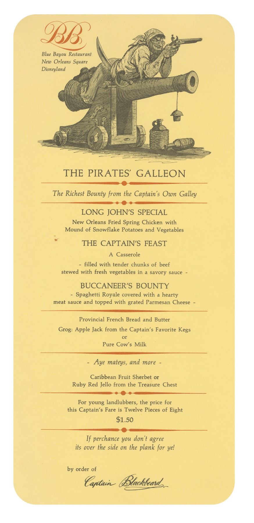 (Disneyland, 1967) A child's menu from the opening year of the Blue Bayou restaurant. Featuring an amusing illustration based on Pirates of the Caribbean above the food options, the menu measures 11"x5" and is in very good condition with minor wear from use.