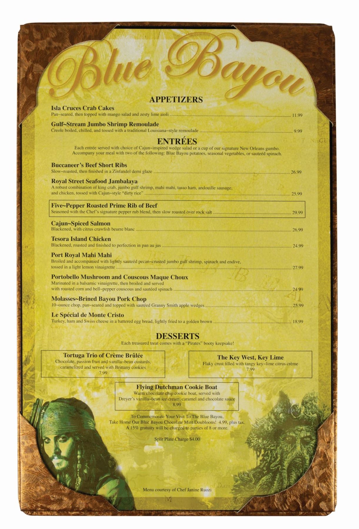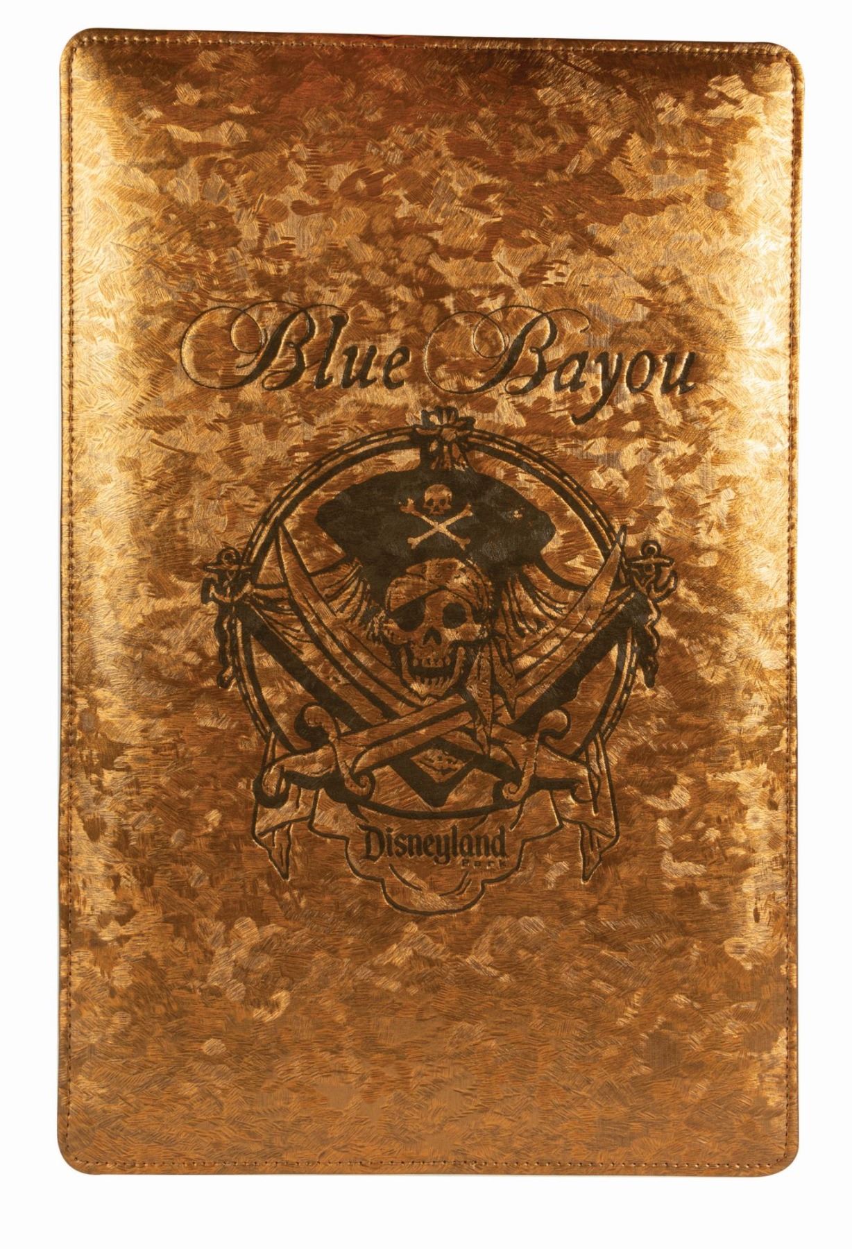 (Disneyland, c.2000s) A gorgeous menu holder from the Blue Bayou restaurant located inside the Pirates of the Caribbean attraction at Disneyland. This menu holder features the name of the restaurant above great Pirates imagery with "Disneyland" written below it. The beautiful copper-colored menu holder shimmers in the light and still includes the original menu on the reverse. Measuring 17.75"x11.5", the menu holder is in very good condition with minor surface wear from use.