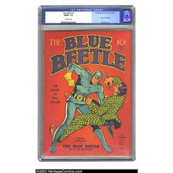 Blue Beetle #1 (Fox Features Syndicate, 1939) CGC FN/VF 7.0 Off-white pages. This is one of the nicest copies that you could hope to find. This issue features the origin of the Blue Beetle, and has a simple, yet powerful cover. The thug's green and yellow checkered outfit against the radiant red background intensifies the vibrancy of the image. Overstreet 2002 FN 6.0 value = $1,293; VF 8.0 value = $2,802. Important notice: We expect to be auctioning lots at the rate of 200-250 per hour. Sometimes eBay Premier live bid software cannot keep up with that pace, so we strongly recommend that you place a realistic proxy bid now as insurance to avoid disappointment. Also please note that all Heritage/CAA lots purchased through eBay Premier carry a 20% Buyer's Premium. Please make sure you read the Terms and Conditions.