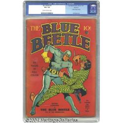 <B>Blue Beetle #1 Rockford pedigree (Fox Features Syndicate, 1939) CGC VG+ 4.5 Cream to off-white pages.</B></I> One of the more recognizable heroes from the Golden Age of comics, the Blue Beetle was first introduced in <B>Mystery Men Comics</B></I> just a few months previously, with reprints from issues 1-5 presented here. Will Eisner's impressive stamp on the book shows up in scripting not only the seven Blue Beetle stories, but also the four Yarko the Great features in this 64-page comic. Eisner's pencils are also on display in the Yarko stories. Overstreet 2004 VG 4.0 value = $896. <BR><BR><B>Important notice:</B> Heritage usually auctions material at the rate of 200-250 lots per hour. On some occasions eBay Live bid software or the Internet may not be able to keep up with the pace of the auction. We recommend placing a realistic absentee bid now as insurance to avoid disappointment. Occasionally the auctioneer may eliminate or reject an eBay Live bid, and the auctioneer may also reopen a lot after the close of the eBay live bidding (usually because we missed an audience bid), and may reject your bid even if it shows you as the winning bidder. By bidding via eBay Live, you agree that Heritage may award the lot to another bidder at its sole discretion under the circumstances described above or any other reasonable circumstances. Since eBay bids are not shown to us until we open the lot on the floor, we treat those bids just like floor bids. In most cases the floor responds before the eBay bid is presented to us, due to Internet lag time, so for consistency we have made it a policy that floor bids are always considered first over tie eBay live bids. Also please note that all Heritage lots purchased through eBay Live carry a 20% Buyer's Premium. Please make sure you read the Terms and Conditions before you bid. </span></font></tr></table></td></tr></table>