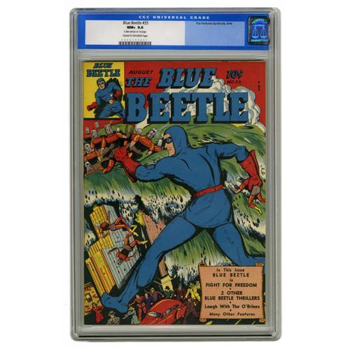 <B>Blue Beetle #33 (Fox Features Syndicate, 1944) CGC NM+ 9.6 Cream to off-white pages.</B></I> This is by far the highest-graded copy in CGC's census, with the runner-up checking in at a mere 7.0! CGC notes, "2 date stamps on 1st page." Overstreet 2006 NM- 9.2 value = $310. CGC census 4/06: 1 in 9.6, none higher.