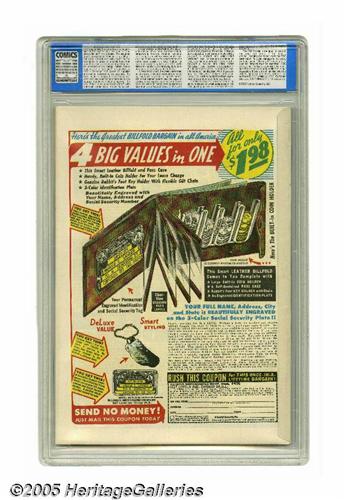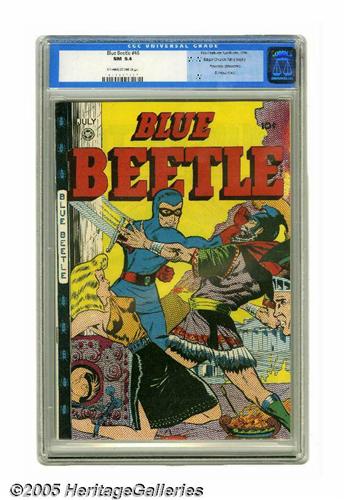 <B>Blue Beetle #46 Mile High pedigree (Fox Features Syndicate, 1947) CGC NM 9.4 Off-white to white pages.</B></I> This is considered the last play-it-straight superhero issue of the title before "sex sells" became the byword beginning with #47. But even this one had a bondage cover! This Mile High copy is easily the highest-graded in CGC's census, the only one above 8.5, in fact. Overstreet 2005 NM- 9.2 value = $315. CGC census 6/05: 1 in 9.4, none higher.