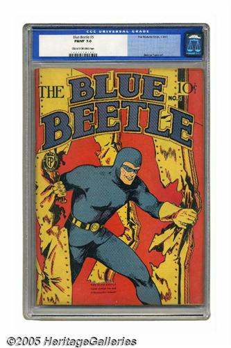 <B>Blue Beetle #5 (Fox Features Syndicate, 1941) CGC FN/VF 7.0 Cream to off-white pages.</B></I> George Tuska art. Overstreet 2005 FN 6.0 value = $198; VF 8.0 value = $413. CGC census 6/05: 1 in 7.0, none higher.