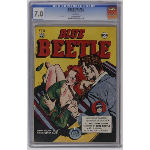 <B>Blue Beetle #53 (Fox Features Syndicate, 1948) CGC FN/VF 7.0 White pages.</B></I> We see this issue much less than some of the other <B>Beetle</B></I> books, but what a humdinger it is! After a few covers co-featuring the blue-clad hero and some "good girls," this was the first to relegate the Beetle to an inset. As John Wooley noted in <B>Collector's Dream</B></I>, "BB's rueful look seems to be saying, sorry kids, but what can you do?" We doubt that Fox received too many complaints about this steamy effort! Inside the issue, there's true-crime fare by artists including Jack Kamen. Note the excellent page quality of this strictly graded copy. Overstreet 2006 FN 6.0 value = $243; VF 8.0 value = $506. CGC census 3/06: 1 in 7.0, 3 higher.