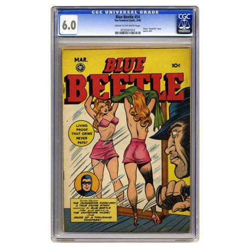 <B>Blue Beetle #54 (Fox Features Syndicate, 1948) CGC FN 6.0 Cream to off-white pages.</B></I> This book always seems to sell for way above the Guide value, and a glance at the cover image will let you know why everybody seems to want a copy. The issue got a mention in <B>Seduction of the Innocent</B></I>, with author Fredric Wertham noting, "Children call these 'headlights' comics." Overstreet 2005 FN 6.0 value = $387. CGC census 12/05: 5 in 6.0, 5 higher.