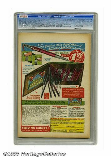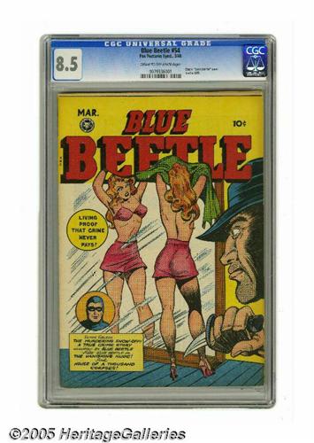 <B>Blue Beetle #54 (Fox Features Syndicate, 1948) CGC VF+ 8.5 Cream to off-white pages.</B></I> Must... write... description but can't... stop... looking at... cover! Seriously, while many "good girl" cover fans would point to one of the <B>Phantom Lady</B></I> issues as the pinnacle of all things va-va-voom-ish, we'd say it's time for the stunning image that graces <B>Blue Beetle</B></I> #54 to get its due. What's surprising is that this cover hasn't been attributed to one of the usual "good girl" aces like Jack Kamen or Matt Baker; it certainly measures up to anything those two ever did. Dr. Fredric Wertham featured the issue in the book <B>Seduction of the Innocent</B></I> with the comment, "children call these 'headlights' comics." Not just children, Doc! Overstreet 2005 VF 8.0 value = $806; VF/NM 9.0 value = $1,240. CGC census 3/05: 1 in 8,5, 2 higher.