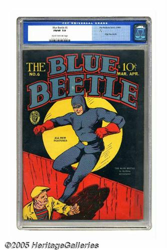 <B>Blue Beetle #6 (Fox Features Syndicate, 1941) CGC FN/VF 7.0 Cream to off-white pages.</B></I> Origin of the Blue Beetle. Overstreet 2005 FN 6.0 value = $186; VF 8.0 value = $388. CGC census 6/05: 1 in 7.0, none higher.