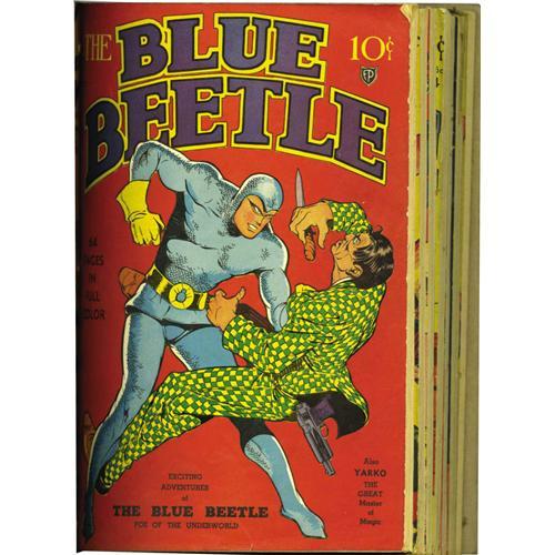 <B>Blue Beetle and other Golden Age Comics Bound Volume (Fox, Columbia and Centaur, 1940-41).</B></I> Though <B>Hit Comics</B></I> with its fantastic Lou Fine cover art is <I>not</B></I> included in this bound volume, the image is on the volume's cover, making for a very attractive book! And look what <I>is</B></I> inside: <B>The Arrow</B></I> #2, <B>Big Shot Comics</B></I> #1-5 and 10, and <B>Blue Beetle</B></I> #1-7. We're not sure what these books have in common other than proximity in the alphabet, as they're from different publishers and different artistic "shops," but it's a Golden Age bonanza in any case! Space prevents us from extolling the many virtues of the individual books, but suffice it to say you would need a lot of time and expense to assemble these comics. The condition is very pleasing, with fresh covers and off-white pages. The front cover of <B>The Arrow</B></I> and the back cover of <B>Blue Beetle</B></I> #7 are detached. Note that these copies were not trimmed prior to binding. A sticker on the spine says "Book 36." Overstreet 2006 VG 4.0 value for group = $3,366.<BR><BR><b>Shipping:</b> Books & Catalogs (<a target="_blank" href="http://www.heritageauctions.com/common/shipping.php">view shipping information</a>)