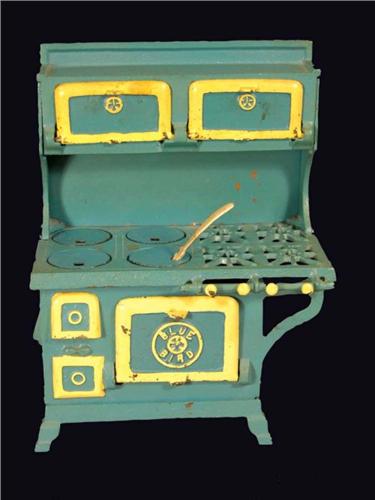 Blue Bird Toy Cook Stove. Complete with minor paint loss in good original condition. 8 X 10 1/2 X 4 1/2 inches.