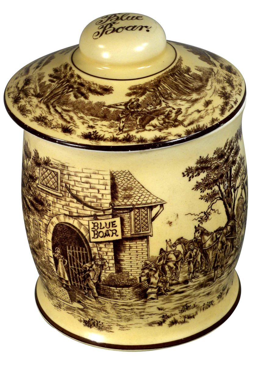 Blue Boar Tobacco Humidor, porcelain. No chips or cracks, excellent condition. 6 inch diameter X 8 inches tall.
