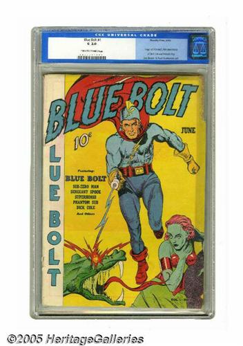 <B>Blue Bolt #1 (Novelty Press, 1940) CGC GD 2.0 Cream to off-white pages.</B></I> Origin of Blue Bolt by Joe Simon. First appearances of Sub-Zero Man, White Rider and Super Horse, Dick Cole, Wonder Boy, and Sgt. Spook. Overstreet 2005 GD 2.0 value = $310. CGC census 2/05: 1 in 2.0, 4 higher.