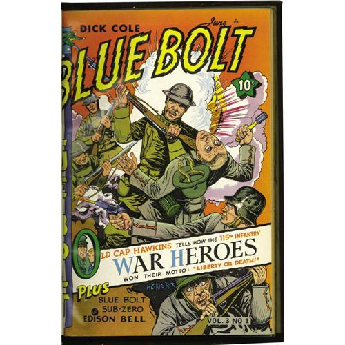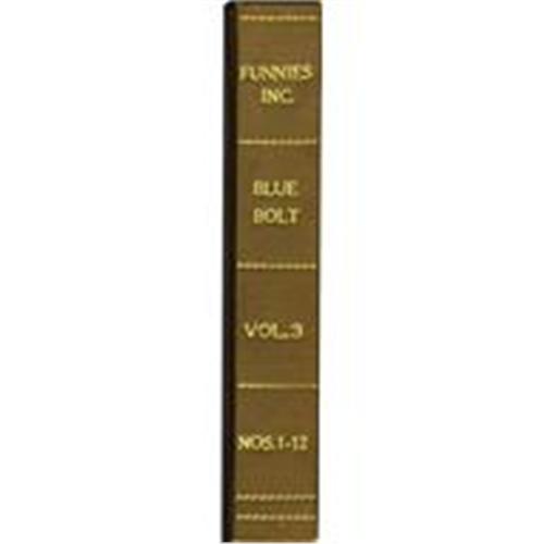 <B>Blue Bolt V3#1-V3#12 Bound Volume (Novelty Press, 1942-43).</B></I> "Funnies Inc." is embossed on the spine of this hardcover volume, and we have no reason to doubt that these are office copies from that organization, the "shop" of artists that produced these comics for Novelty Press. The quality of the comics is certainly consistent with that -- the cover colors are almost impossibly fresh, as we've seen with other volumes bound shortly after publication. The interior pages have tan edges for the most part. Note that these comics have not been trimmed in the binding process. Overstreet 2006 VG 4.0 value for group = $378.<BR><BR><b>Shipping:</b> Books & Catalogs (<a target="_blank" href="http://www.heritageauctions.com/common/shipping.php">view shipping information</a>)