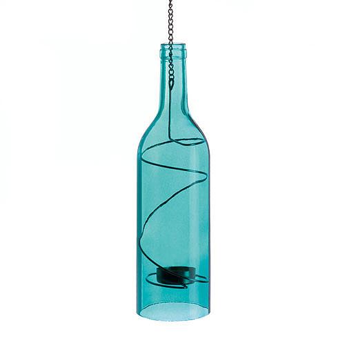 Blue Bottle Hanging Lamp **|**|** A coil of black metal holds the perfect seat for a tealight candle, surrounded by the most beautiful blue glass bottle. Hang it up from your ceiling or porch roof for country chic glow.Description Details Item weight: 1 lb.Product Dimensions: 3 diameter x 11" high; 18" high with chain.Product Material: Glass and iron.UPC Code: 849179021146.Packaging: 1 EA"