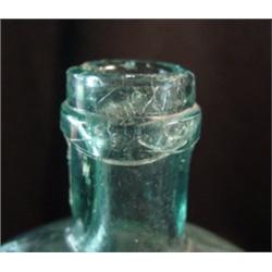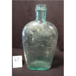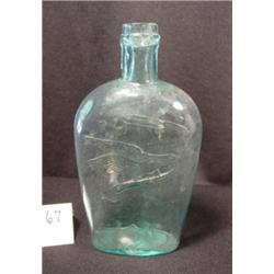 7 3/4" by 4" by 1 3/4" lip, Blue Bottle with 2 images, front says, "Union" with 13 Stars and shield with hands clasped. Back is flying eagle with shield & banner. It is seamed with applied top chips on lip, foggy glass