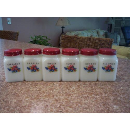</font></strong>This is a refurbished set of six spice jars done in the blue calico design of the old Tipp City jars. The jars are old milkglass jars with the fluted side and the tops are original. The tops have been repainted and the decals are new. The decals are copies of the old design and a very close match. There are metal shaker inserts under the tops. In this set you have a Paprika, Cinnamon, Allspice, Ginger, Nutmeg and Cloves. There are no chips or cracks. This is a cheery set sure to brighten any kitchen.</font>