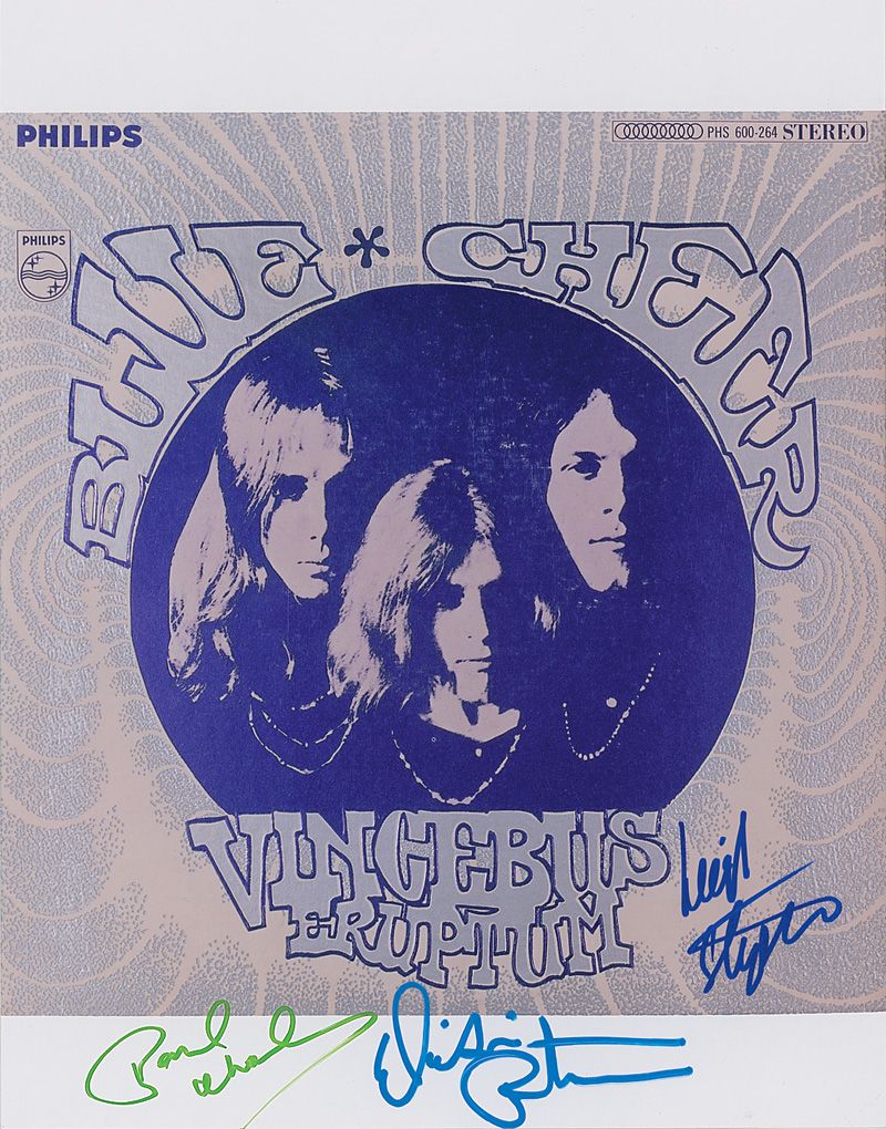 Color glossy 11 x 14 photo of the Vincebus Eruptum album cover, signed in ink and felt tip by Dickie Peterson, Leigh Stephens, and Paul Whaley. In fine condition.