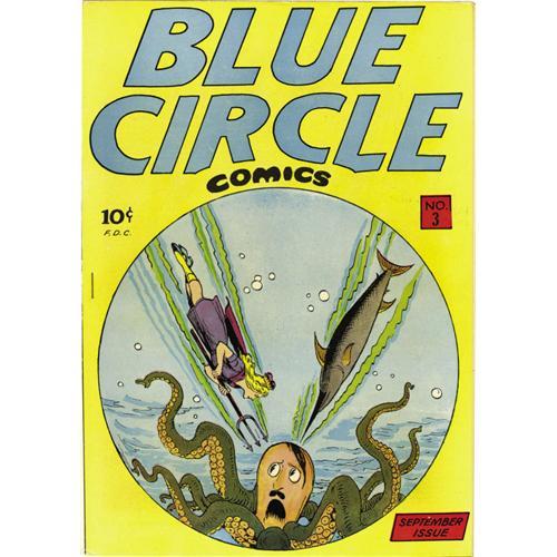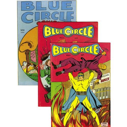 <B>Blue Circle Comics #1-5 Mile High pedigree Group (Rewl/Rural Home, 1944-45).</B></I> The Blue Circle is the name of a roundtable of justice-lovers as well as the costumed hero who does their bidding! He, the Steel Fist, and underwater heroine Maureen Marine are among the stars of this series, published by Rewl and later Rural Home (which are both just different names for Enwil). Every comic included here is an Edgar Church copy: #1 (VF/NM), 2 (VF/NM), 3 (NM; "Hitler as an octopus" cover), 4 (NM+) and 5 (VF-). Approximate Overstreet value for group = $1,000.<I>From the John McLaughlin Collection</B></I>. <BR><BR><B>Important notice:</B> Heritage usually auctions material at the rate of 200-250 lots per hour. On some occasions eBay Live bid software or the Internet may not be able to keep up with the pace of the auction. We recommend placing a realistic absentee bid now as insurance to avoid disappointment. Occasionally the auctioneer may eliminate or reject an eBay Live bid, and the auctioneer may also reopen a lot after the close of the eBay live bidding (usually because we missed an audience bid), and may reject your bid even if it shows you as the winning bidder. By bidding via eBay Live, you agree that Heritage may award the lot to another bidder at its sole discretion under the circumstances described above or any other reasonable circumstances. Since eBay bids are not shown to us until we open the lot on the floor, we treat those bids just like floor bids. In most cases the floor responds before the eBay bid is presented to us, due to Internet lag time, so for consistency we have made it a policy that floor bids are always considered first over tie eBay live bids. Also please note that all Heritage lots purchased through eBay Live carry a 22.5% Buyer's Premium. Please make sure you read the Terms and Conditions before you bid. This lot is being auctioned in conjunction with a live floor auction by Heritage Auction Galleries. All final auction and invoice information will be supplied by Heritage Auction Galleries, and all other information should be considered preliminary. Lot:50106 <BR><BR><B>Winning Notification and Billing:</B> After the FINAL session in this auction is complete, Heritage will send e-mail and snail mail invoices. This process normally takes several days. All final auction and invoice information will be supplied by Heritage Auction Galleries, and all other information should be considered preliminary. <BR><BR>This auction will be conducted on a live auction floor and over the Internet through eBay Live. If you choose to place an absentee bid, please take a moment to <font color='#0000ff'><u><a href='http://pages.ebay.com/liveauctions/help/before/laabsentee.html'>learn how eBay Live absentee bidding works</a></u></font><font color='#000000'>