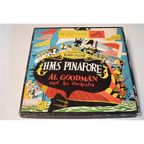 Box set of five ("COMPLETELY BLUE") Records of one of the great operas; The H. M. S. Pinafore written by Gilbert and Sullivan and features Al Goodman and his Orchestra. Also, a sheet inside that tells a small bit of history of Gilbert and Sullivan and explains the story behind the H. M. S. Pinafore; which was a British Ship, and of the Captain's daughter, Josephine and her courtships. The box of records measures 7 1/4 inches by 7 1/4 inches. Each record is still in it's own mint sleeve. Excellent Condition. Late 40's. Collector's item.