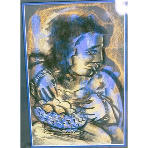 Terrific original signed pastel in school of Picasso. Great strong colors of Electric Blue, charcoal and wheat. Signature is strong but slightly indecipherable (Lower Left). Frame is 3" wide in silver leaf with red highlights. Double matted, framed with glass. Excellent Condition.