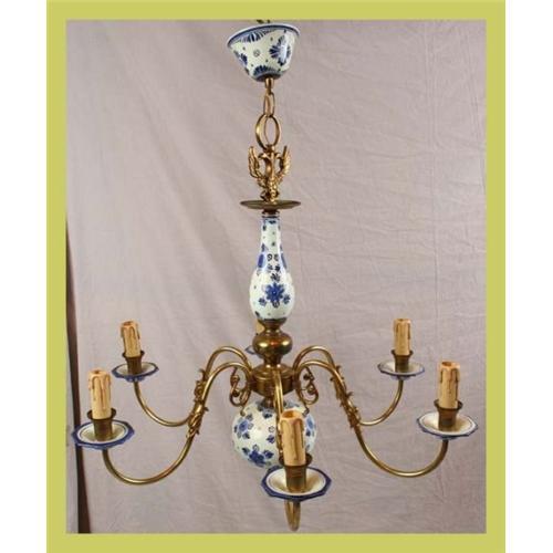 </STRONG>Title: 1950 Dutch 6-Arm Blue Delft Chandelier Flowers </STRONG><P>Item #: 6-702-0</P><P>Comment: Beautiful Blue Delft chandelier would look great in your home!</P><P>Condition: Damage to top due to age and use.</P><P>Dimensions (in.): 27H 28.5W 28.5D </P><P>Age (ca.): 1950</P><P>Origin: Holland</P><P>Size: 6-Arm</P><P>Style: Blue Delft</P><P>Material: Ceramic</P><P>Material 2: Brass</P><P>Object: Chandelier</P><P>Subject: Flowers</P><P>Piece Type: Lighting</P><P>Special Message: <P>Our chandeliers are typically measured from lowest point of the bottom of chandelier to the cover that attaches to ceiling. If you have any questions regarding height or other dimension of a particular chandelier, please contact EuroLuxAntiques. We will not be held responsible for misunderstandings due to the way we measure the size of our chandeliers. Chandeliers listed by EuroLuxAntiques were functioning in our retail location at the time of listing on various online sales channels, however, EuroLuxAntiques and EuroLux Imports, Inc., makes no warranties, express or implied, regarding safety, future functioning, fire hazard or compliance with applicable building codes in your area. We recommend that you seek the advice of ...