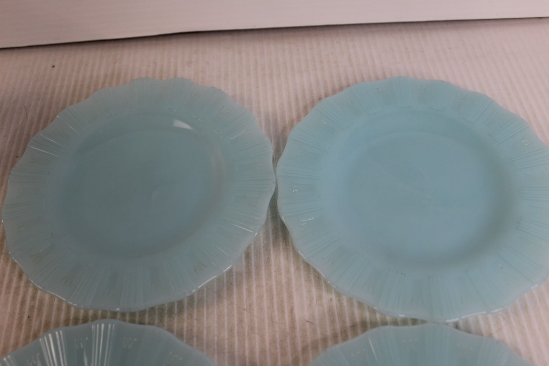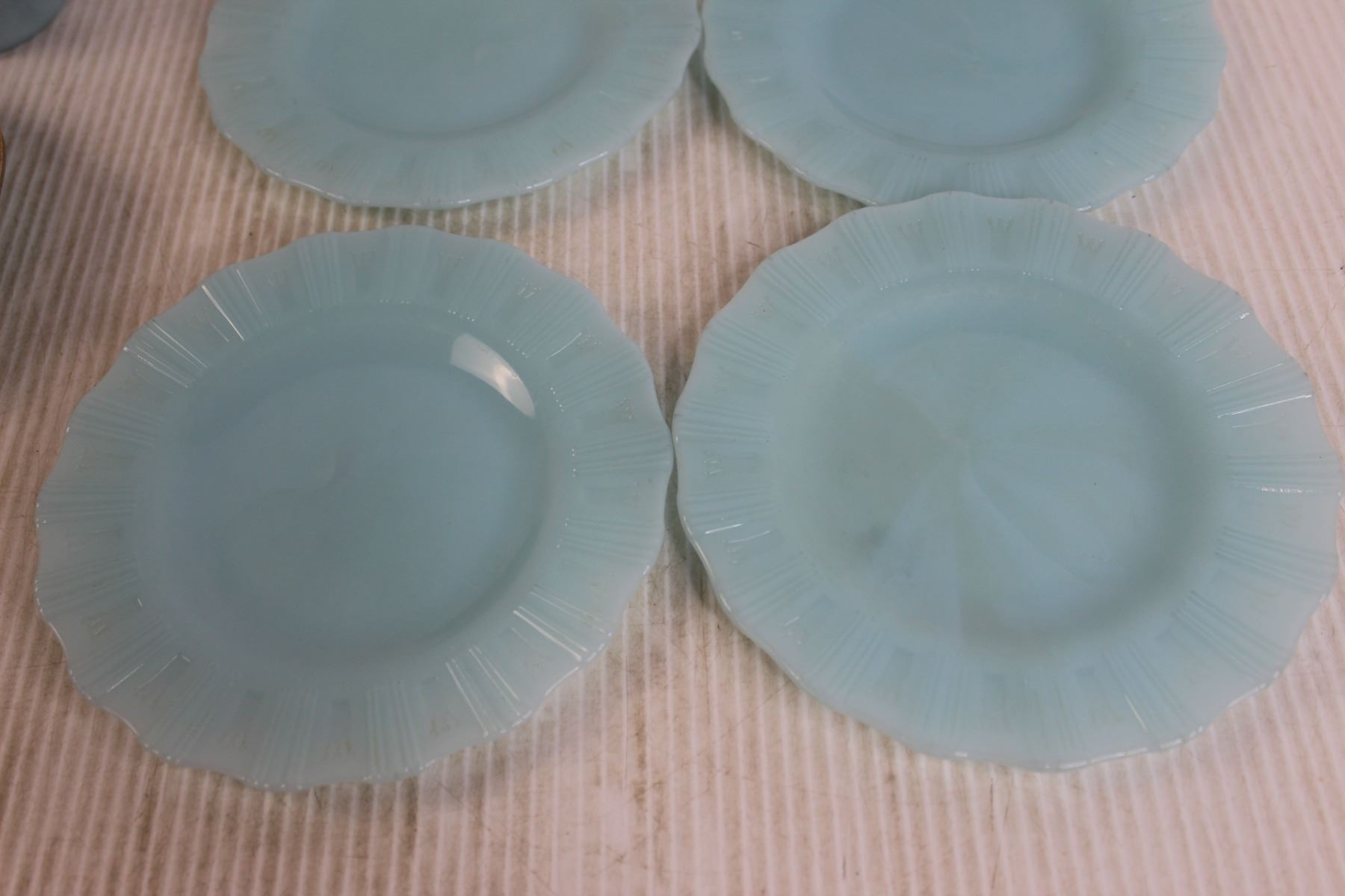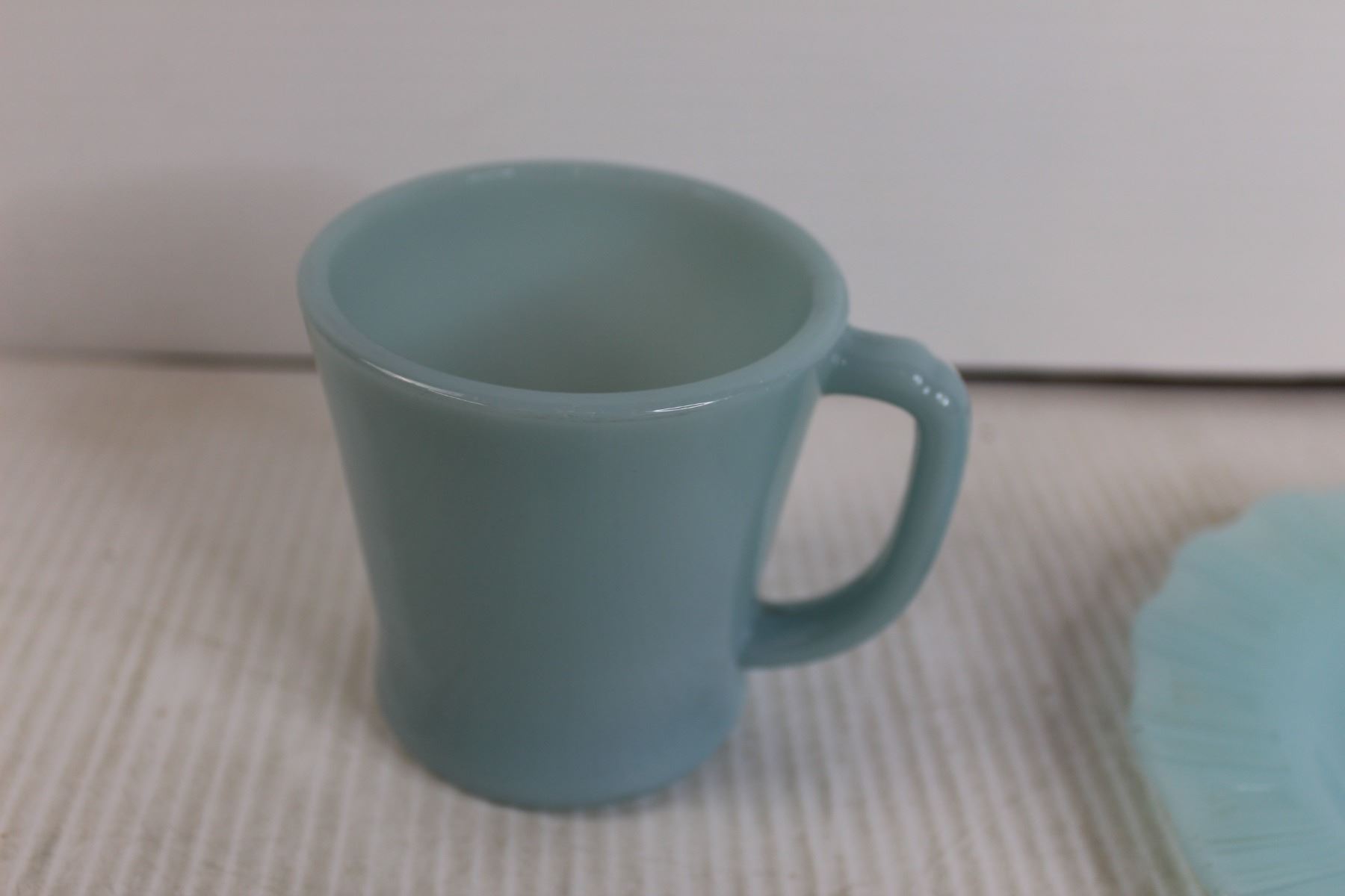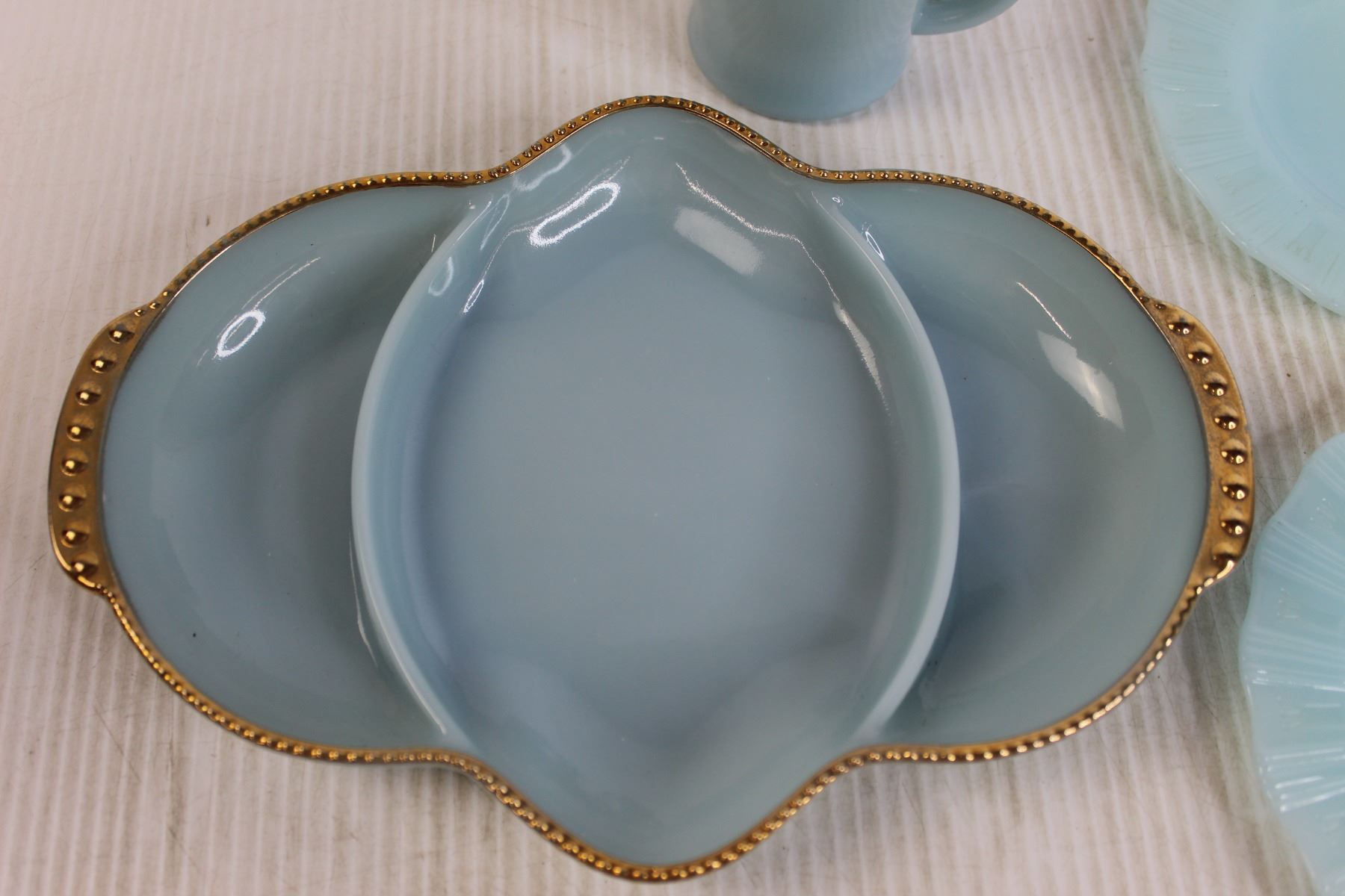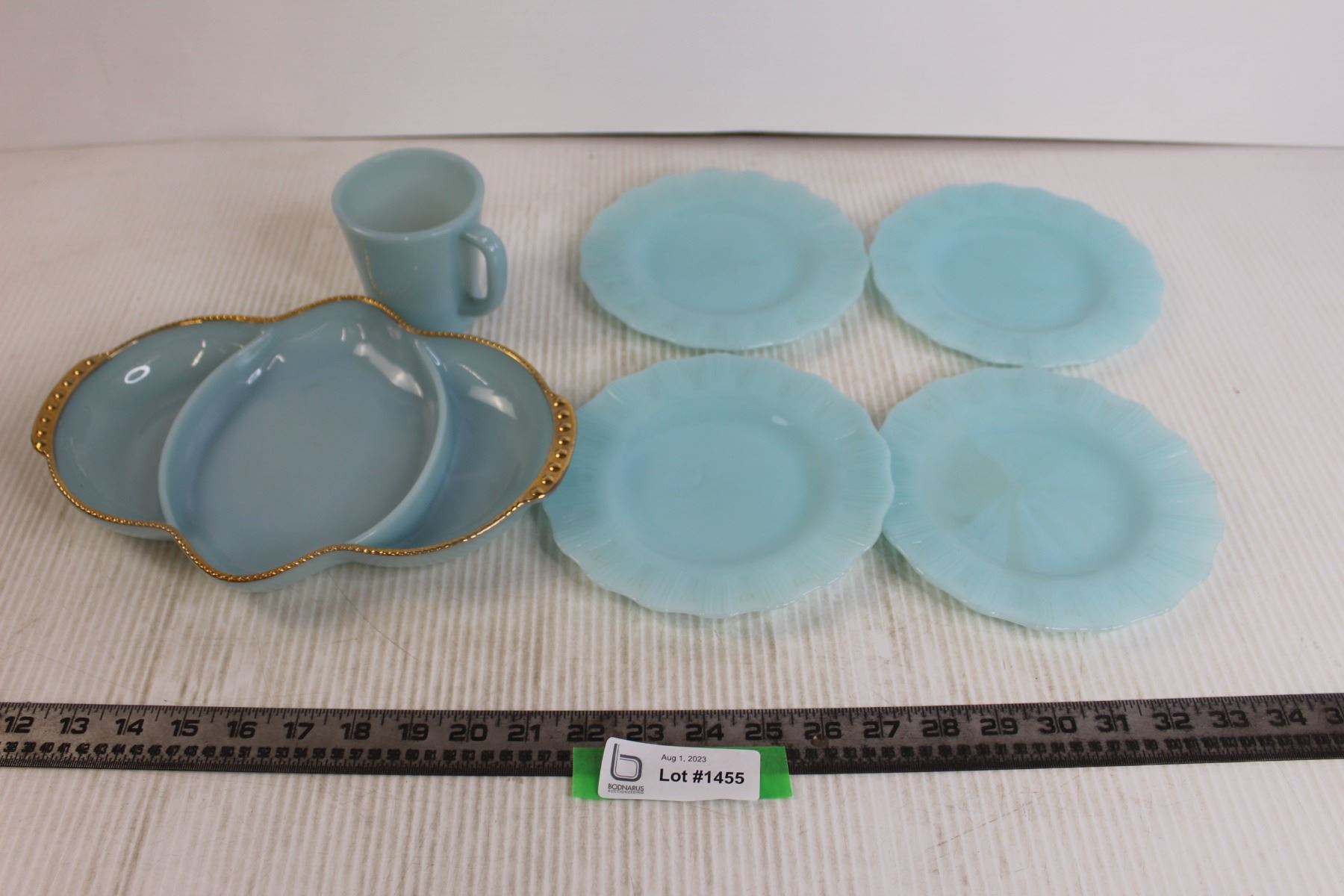 Blue Delphite Fire King Serving Tray and Mug, (4) Blue Azure Pyrex Dessert Plates (Crown Design)
