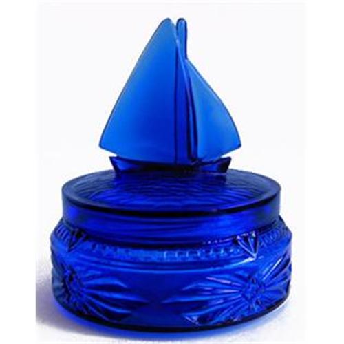 Known as Sailboat and shown on page 51 of Whitmyer - Bedroom & Bathroom Glassware of the Depression Years. The lid is embossed with waves, the finial is a sailboat with a large double sail, the jar is decorated with sunrays and diamond shapes. Measuring about 5 1/2" tall to the top of the sail, and 3 1/2" in diameter this jar and lid are in pristine condition not even any roughness around the rims. Rare in this condition - rarer still in cobalt blue