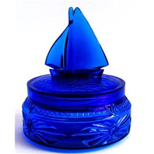 Known as Sailboat and shown on page 51 of Whitmyer - Bedroom & Bathroom Glassware of the Depression Years. The lid is embossed with waves, the finial is a sailboat with a large double sail, the jar is decorated with sunrays and diamonds. Measuring about 5 1/2" tall to the top of the sail, and 3 1/2" in diameter this jar and lid are in pristine condition not even any roughness around the rims. Rare in this condition - rarer still in cobalt blue