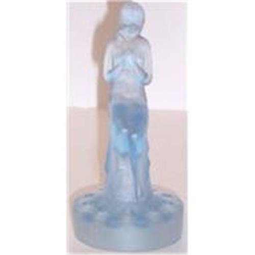 This is the famous and original Sowerby Seated Lady Figural Flower Frog in beautiful Art Deco blue glass. This 'Stump Lady" as she is also known, is demurely sitting in a tree stump with her hands folded over her breast. She has a diaphenous fabric draped over her legs. The height is 6.25 inches and there are 10 flower holes around the base.