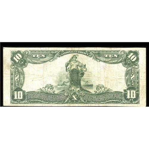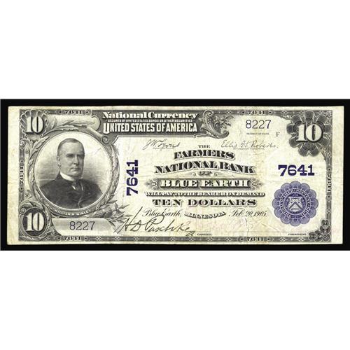 <B>Blue Earth, MN</B></I> - $10 1902 Plain Back Fr. 624 <B>The Farmers NB</B></I> Ch. # 7641<BR>This very presentable <B>Fine</B></I> note is one of only four $10 Plain Backs from here. There were two banks located in this Faribault County locale and this one closed its doors in March of 1930, when it was absorbed by its stronger rival, the First National Bank, which then continued to issue under the combined title of the First and Farmers National Bank. This note bears one of those great titles that makes the collecting of Nationals an almost addictive pursuit.