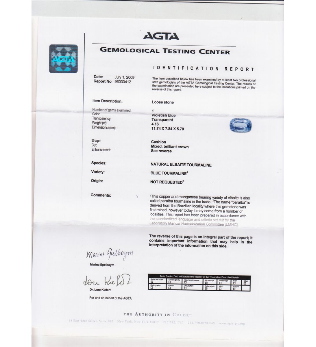 14kt White Gold 9.53 Approx grams including, 4.15ct Blue Elbaite Tourmaline Rare Stone, .33cttw Round Diamond G-H color VS-SI clairty with AGITA certifcate