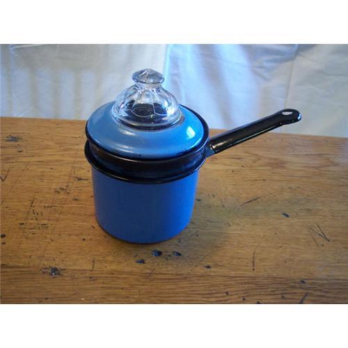 Very unusuale piece.Small size coffee boiler that looks like a little pan.Great blue color.Minor chipping on inside basket and one area by the glass percolator top.This is listed in the granitware book.