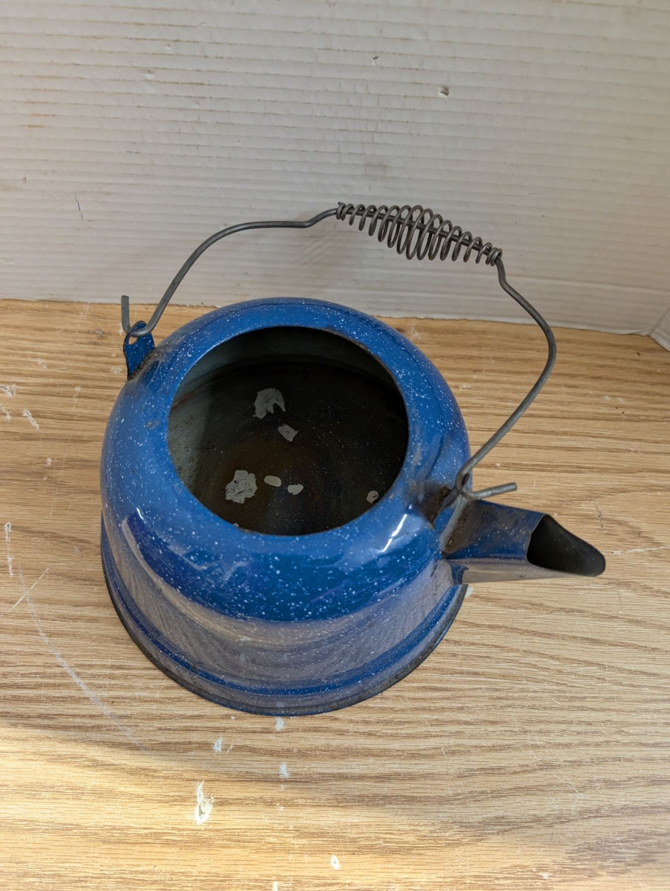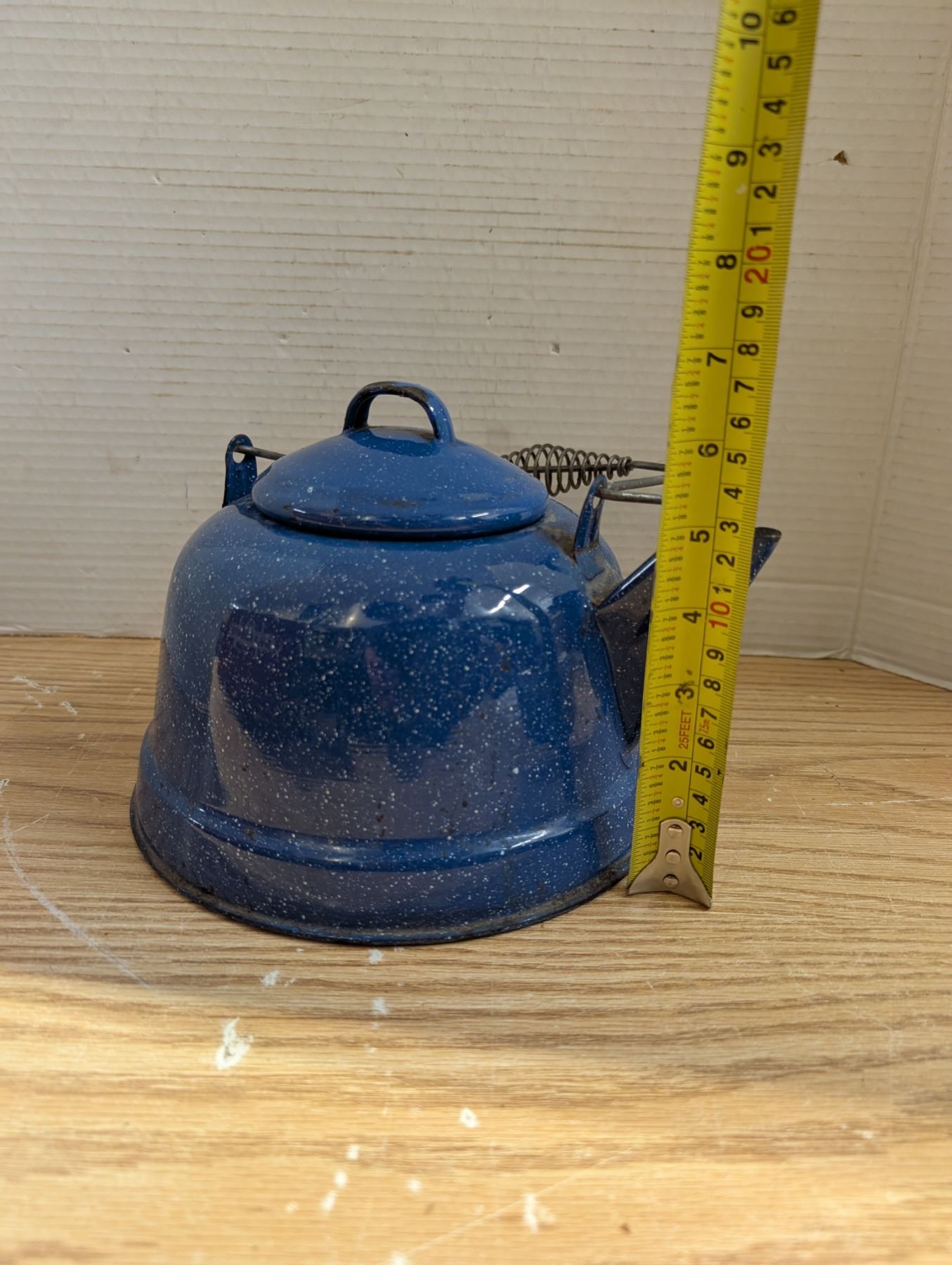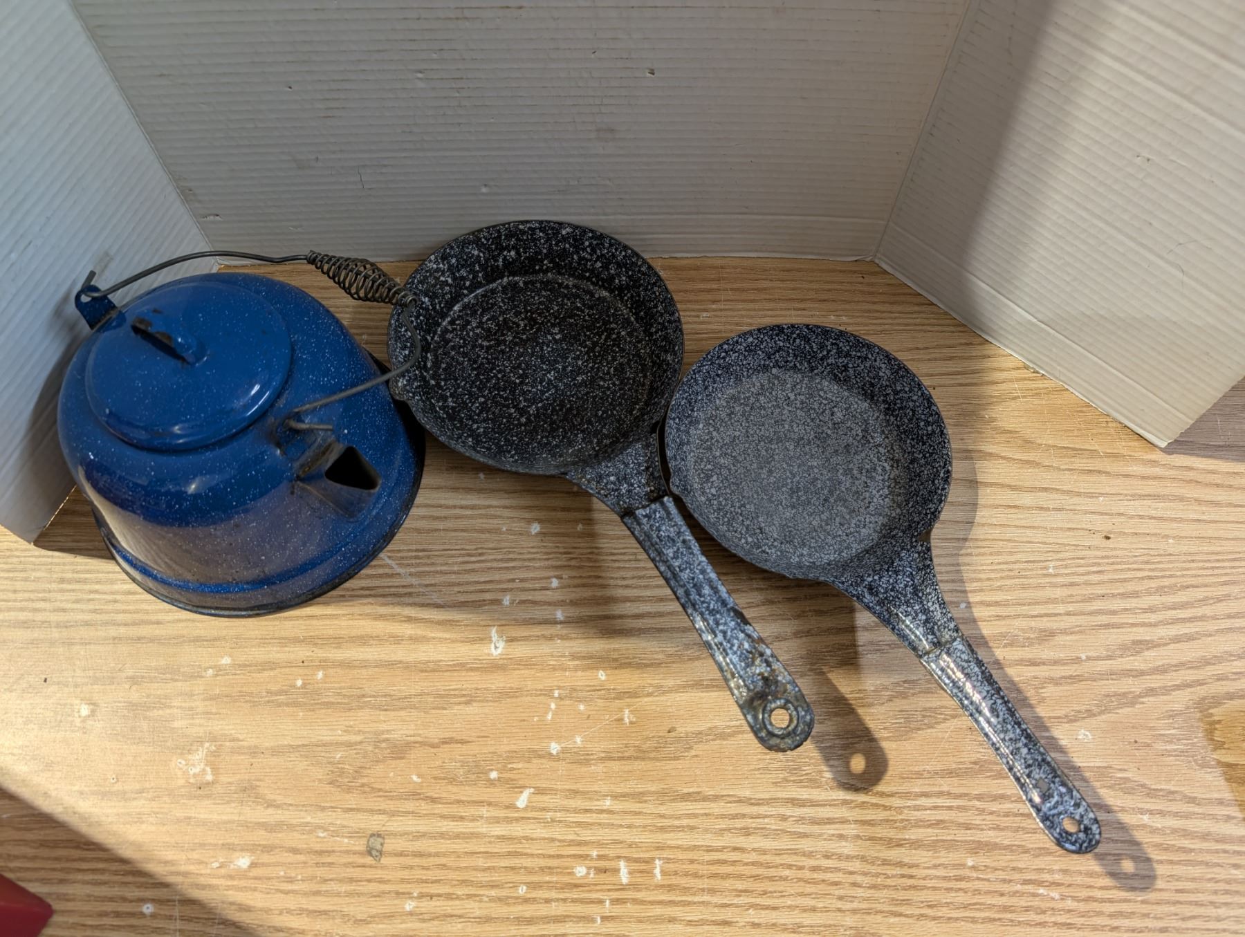 Blue Enamel Kettle And (2) Enamel Frying Pans