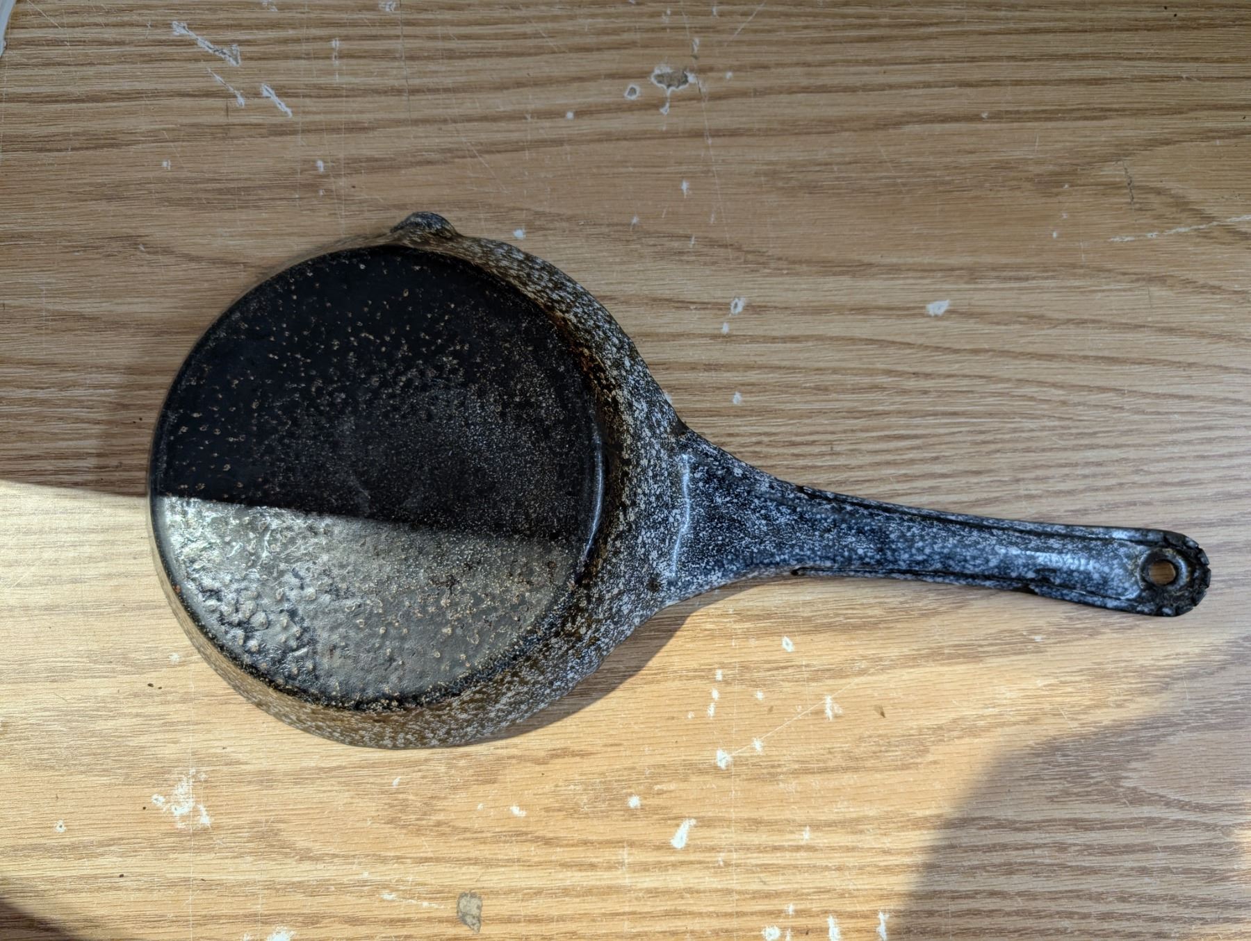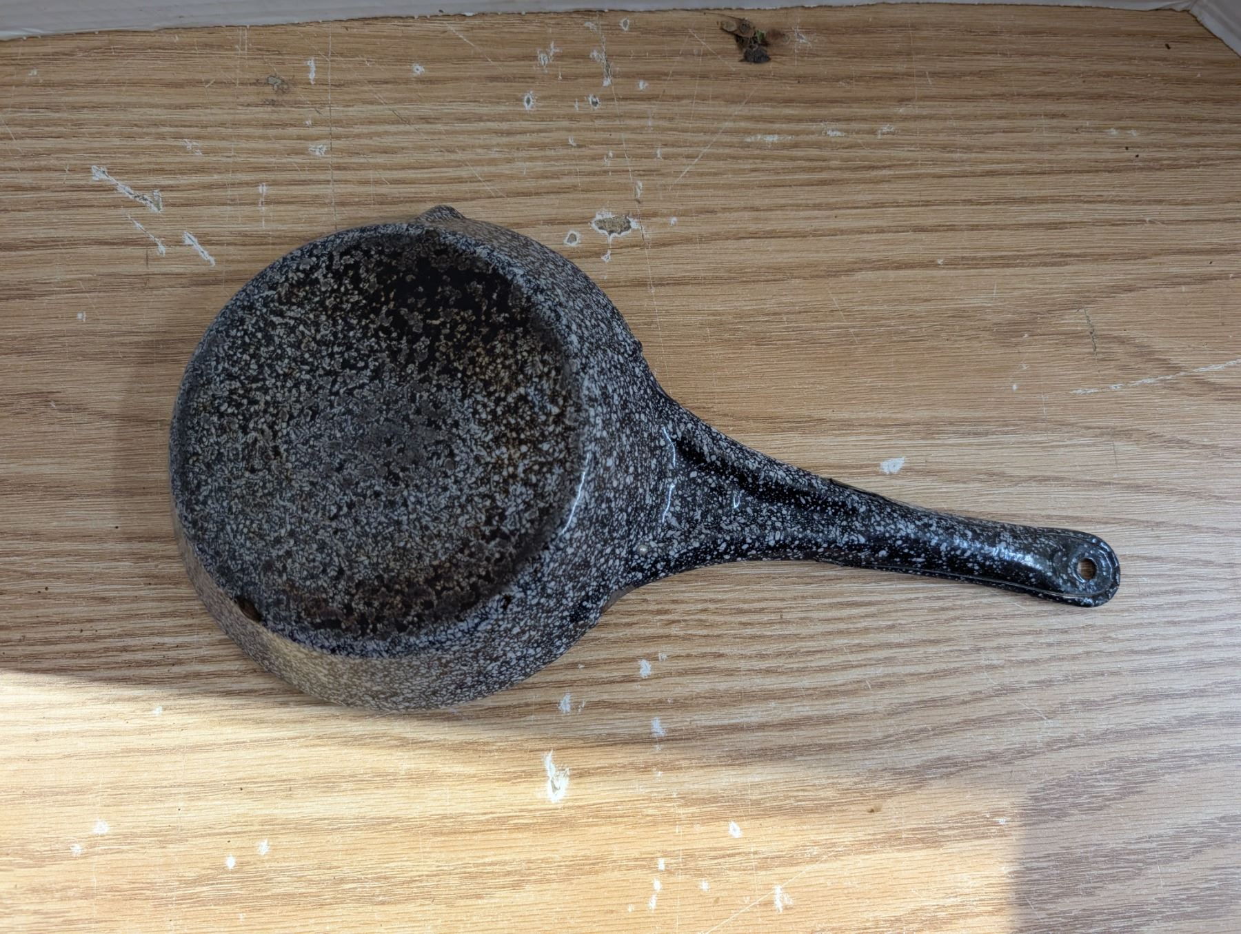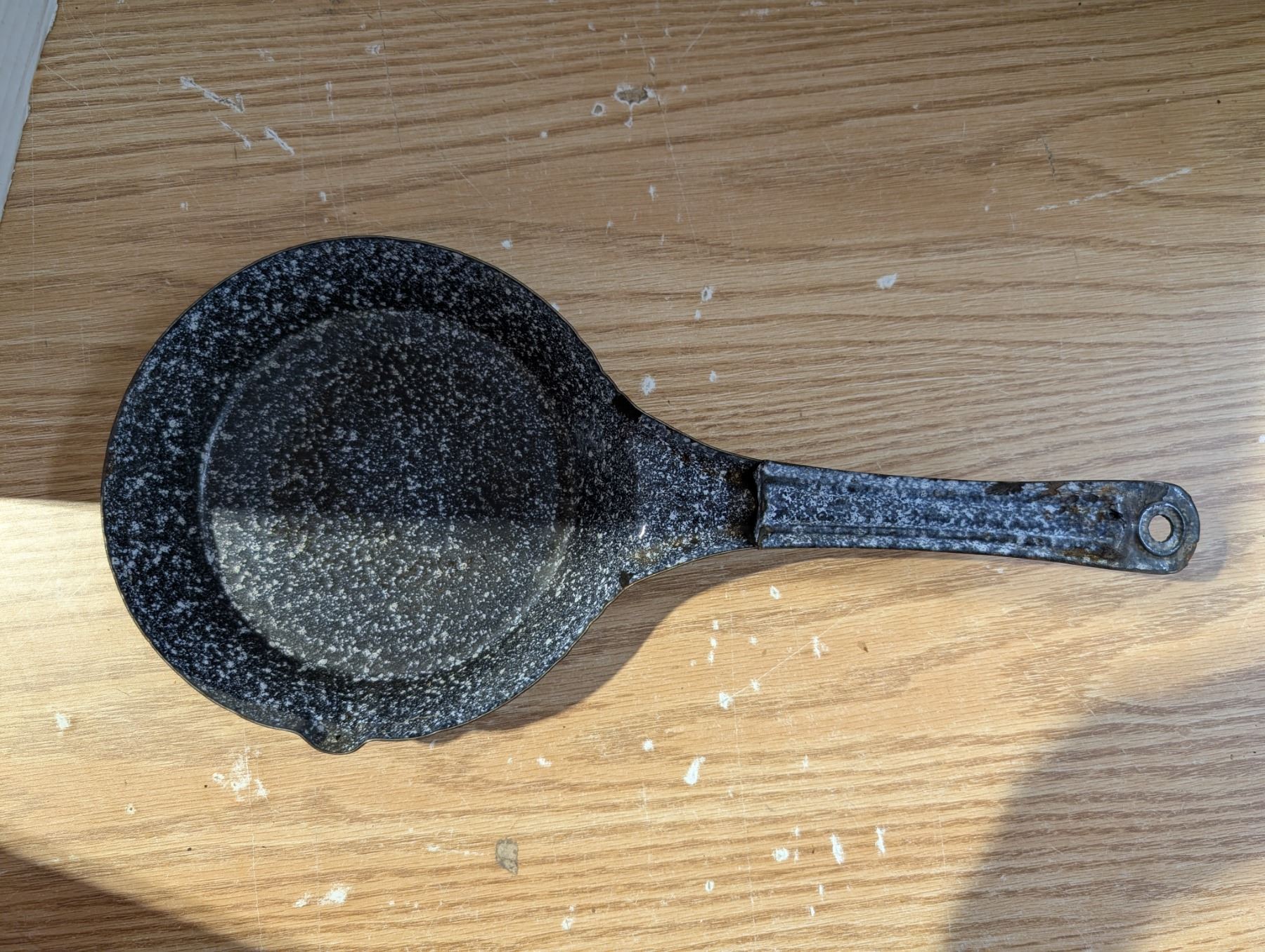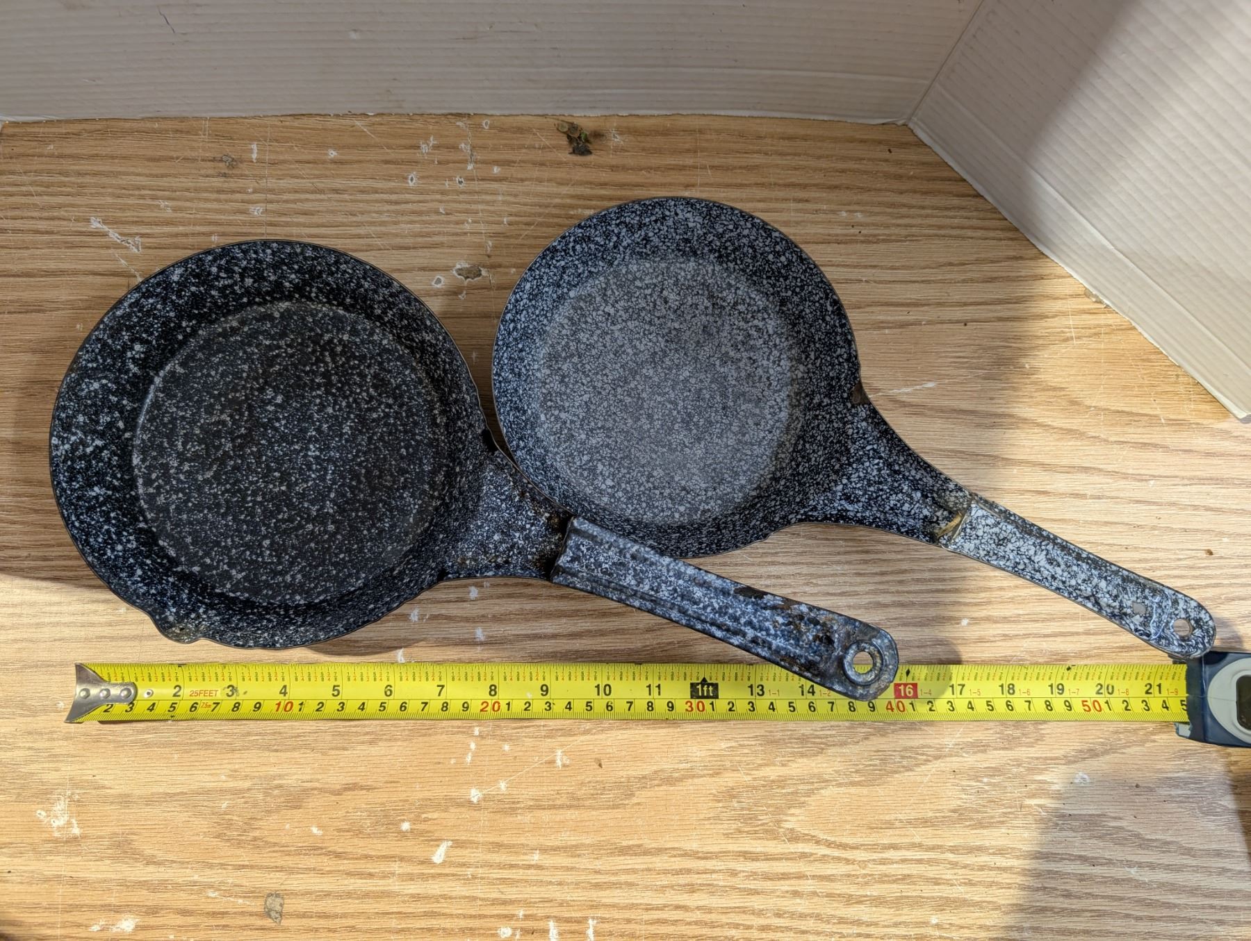Blue Enamel Kettle And (2) Enamel Frying Pans
