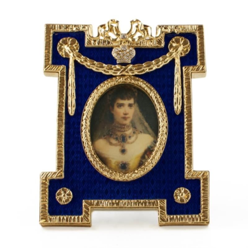 The photo frame is in two color gold-mounted green enamel surrounded by a crystal set ribbon tie suspended by a laurel garland. The frame's edges are covered with golden chased laurel border. This is a copy of picture frame made by Carl Faberge workmaster Michael Perchin (1899-1908) . Features: Dimensions: 4'' (H) x 3'' (L) Pewter, Enamel, Crystals Faberge is a trademark of Pallinghurst Resources LLP. This piece of art should not be associated with Pallinghurst Resources LLP, Faberge Limited Co. who acquired the Faberge trademark in 2007. This item is an exacting replication of a piece of priceless value.