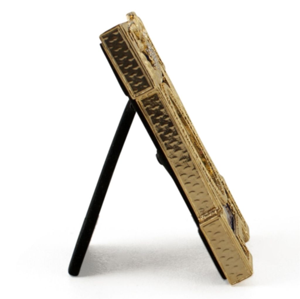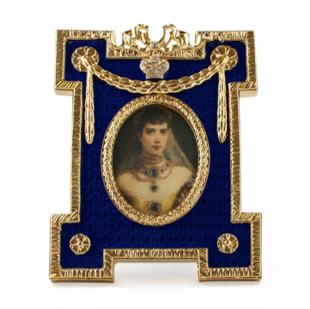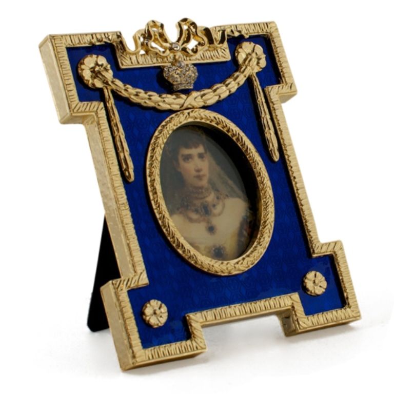 The photo frame is in two color gold-mounted green enamel surrounded by a crystal set ribbon tie suspended by a laurel garland. The frame's edges are covered with golden chased laurel border. This is a copy of picture frame made by Carl Faberge workmaster Michael Perchin (1899-1908) . Features: Dimensions: 4'' (H) x 3'' (L) Pewter, Enamel, Crystals