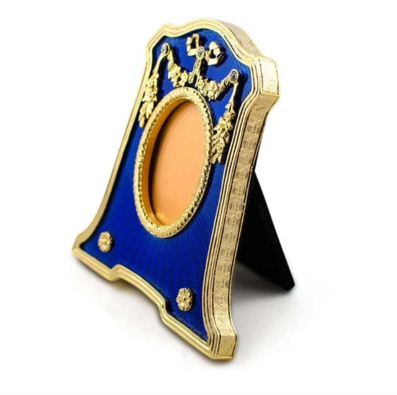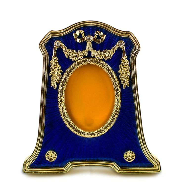 Blue Enameled Guilloche Faberge Inspired Frame, Dimensions: 4.5'' (H) x 3.75'' (L) Photo Opening Dimensions: 1.75" (H) 1.25" (W) Pewter, Enamel, Crystals