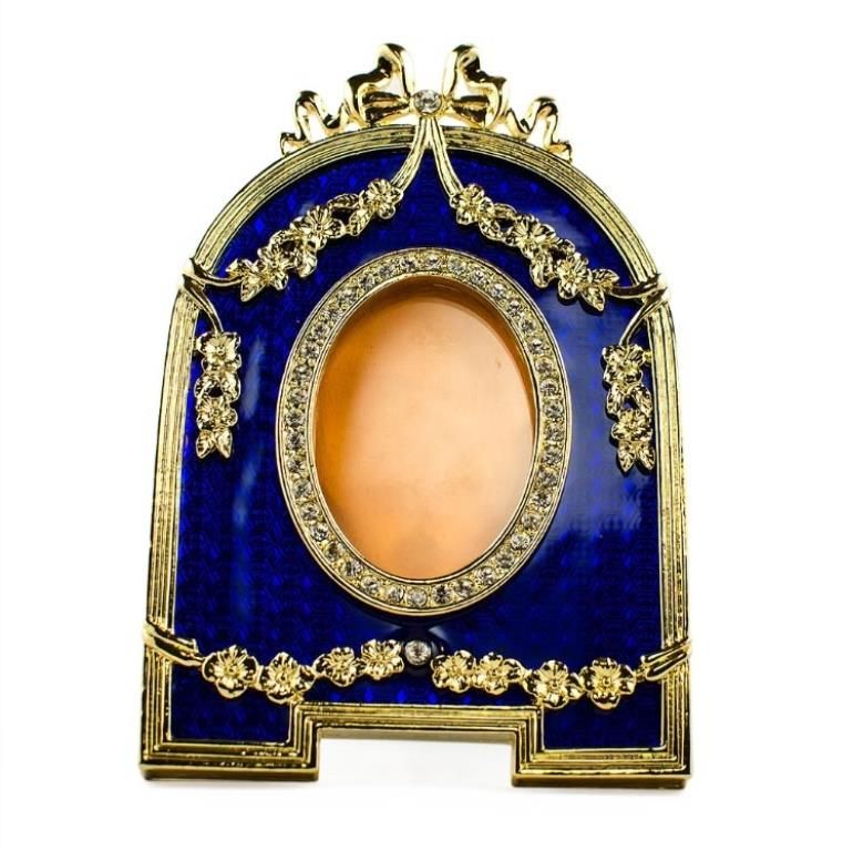 Blue Enameled Guilloche Faberge Inspired Frame, Dimensions: 4.5'' (H) x 3.75'' (L) Photo Opening Dimensions: 1.75" (H) 1.25" (W) Pewter, Enamel, Crystals