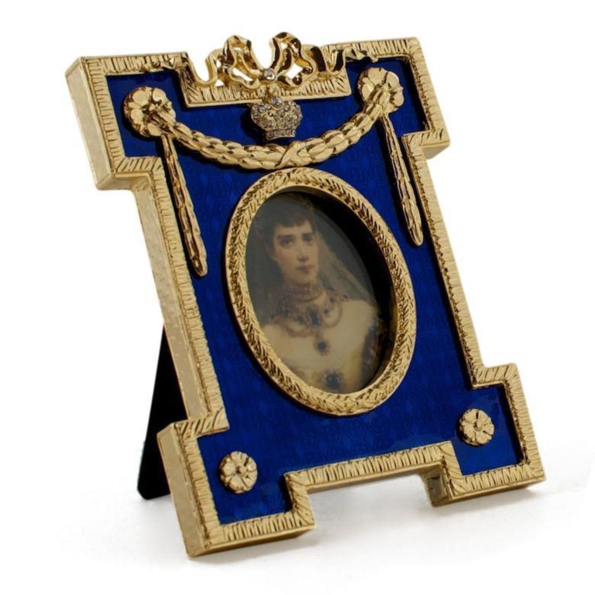 Blue Enameled Guilloche Russian Royal Picture Frame The photo frame is in two colors gold-mounted green enamel surrounded by a crystal set ribbon tie suspended by a laurel garland. The frame'sedges are covered with golden chased laurel border. 4'' (H) x 3'' (L) Pewter, Enamel, Crystals Gold Plated Boxed