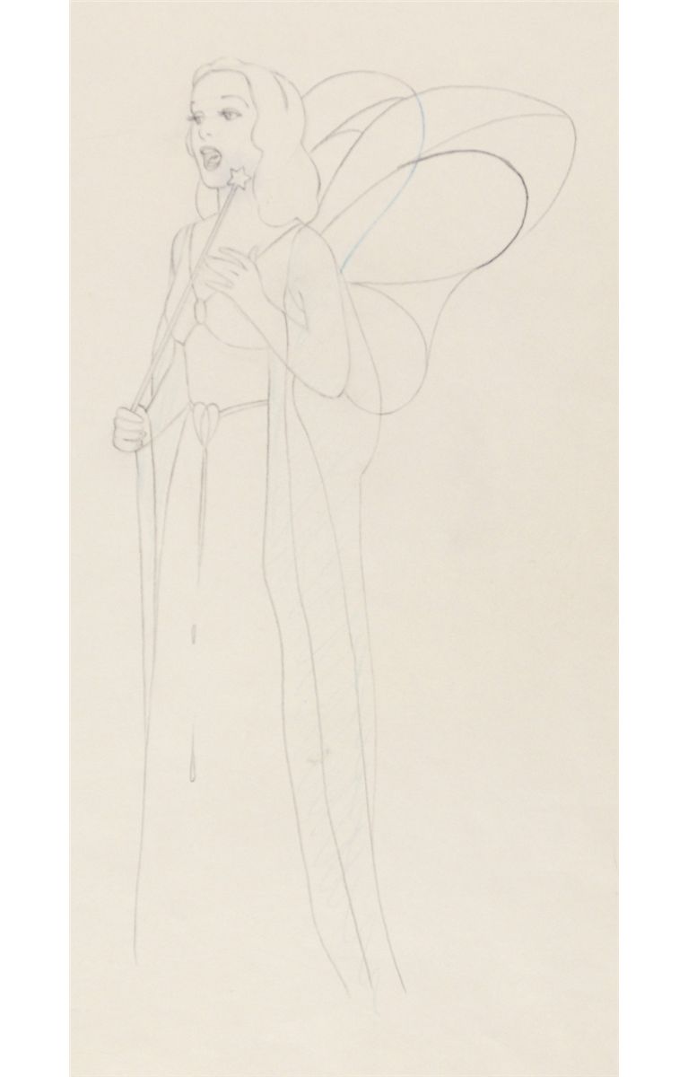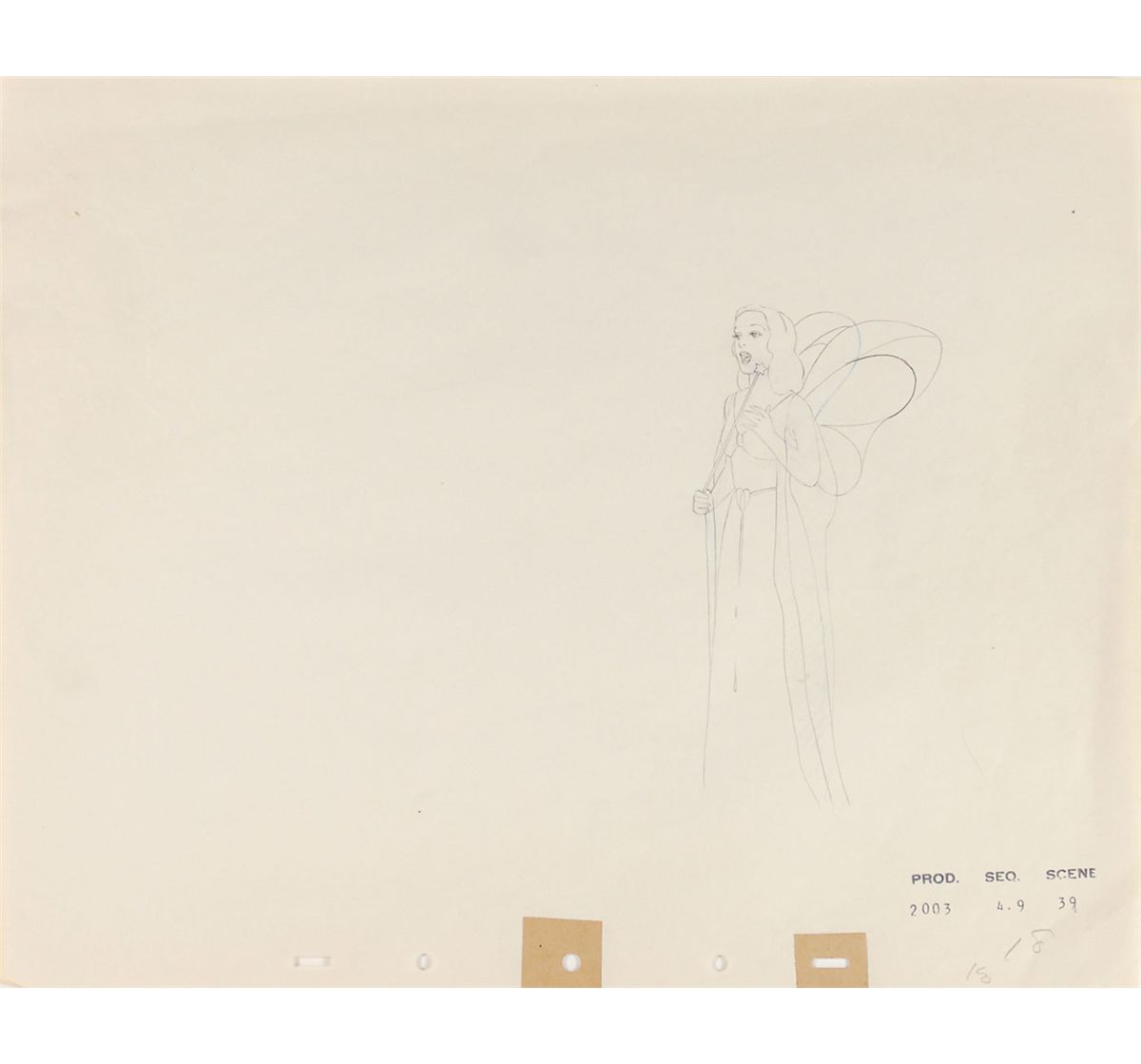 (Walt Disney Studios, 1940) Original production drawing featuring Blue Fairy from Pinocchio, showing her in a full-length pose. Accomplished in graphite on untrimmed 15.5 x 12.5 animation paper. Image measures 3.5 x 7. In fine condition. The Blue Fairy was animated by Jack Campbell from live-action footage of Marge Champion and voiced by Evelyn Venable. With strict instructions to avoid a ‘glamour girl’ appearance for the Blue Fairy, Disney’s animators went though a long process of revisions before achieving her final look; while she did develop into a stunning, sparkling woman—strongly suggesting the inspiration of Jean Harlow—Walt was pleased with the final result nonetheless.