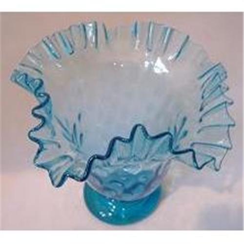 Fenton bowl pinched or crimped coin dot footed in a desirable shade of blue. ca. 1930. On the bottom, you can see a distinct blowpipe pontil scar.
