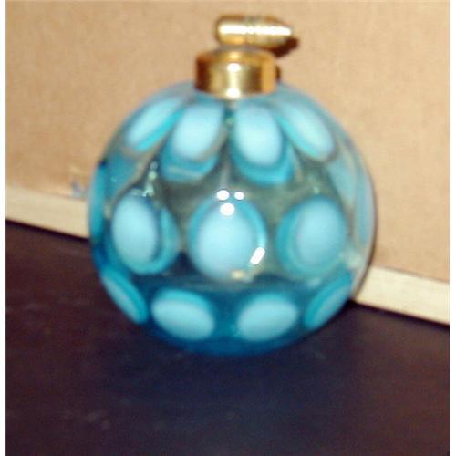 Lovely light blue Fenton like or may be Fenton perfume bottle with white petals and circles. I haven't cleaned it out inside. Brass top, but no atomizer. Buyer pays shipping and handliing costs.