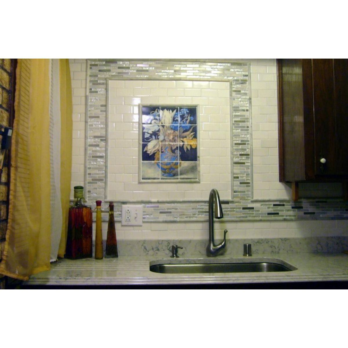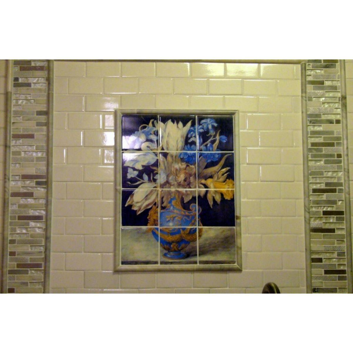 Blue Floral Still Life scene, tumbled marble art tile set of 12 ( 4" X 4" each ) 12" X 16" overall size.Â